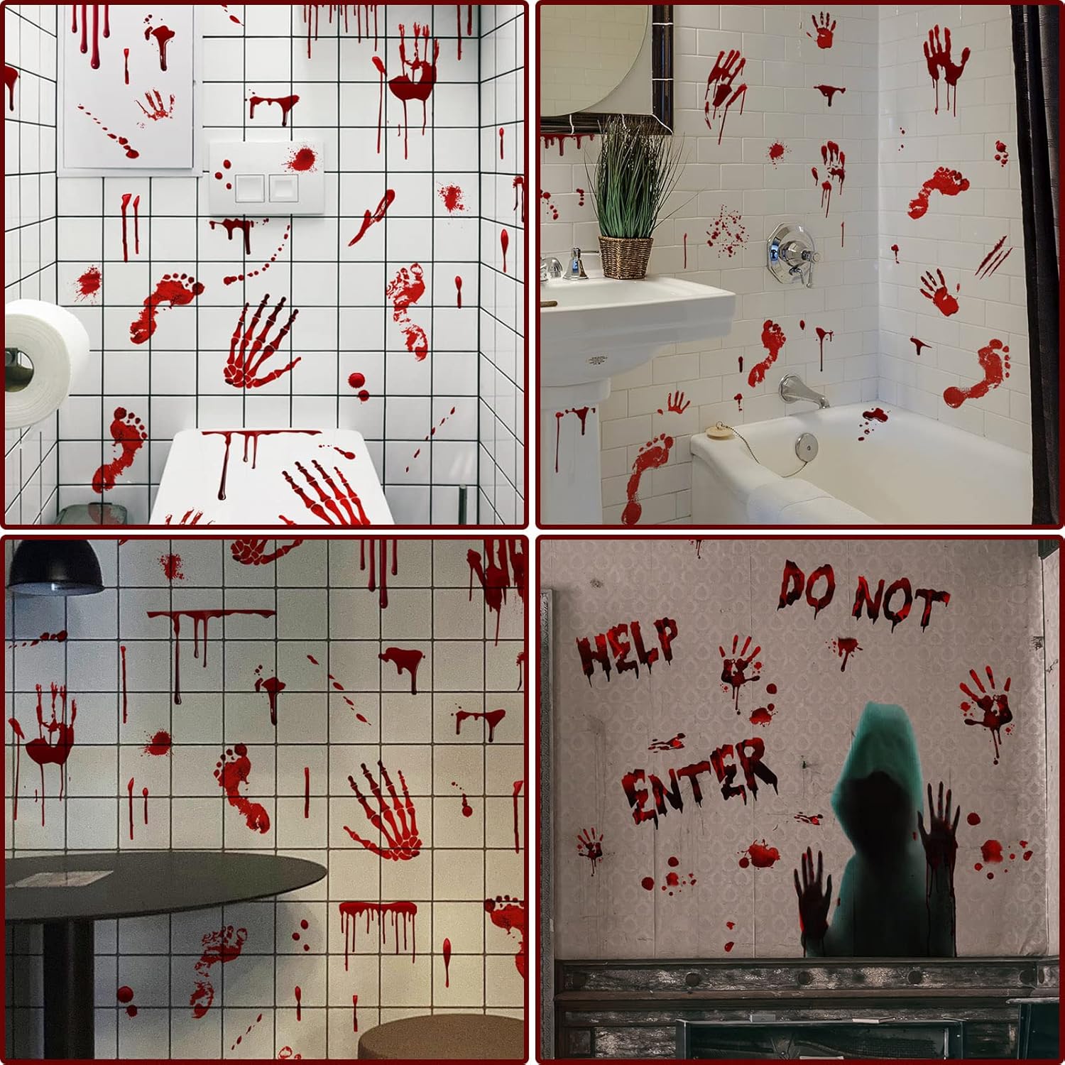 ✅ Темна атмосфера - набір страшних наклейок із закривавленими руками, плямами, відбитками рук і моторошними силуетами. Ідеально підходить для Хелловіна, тематичних вечірок або для створення будинку жахів із привидами.