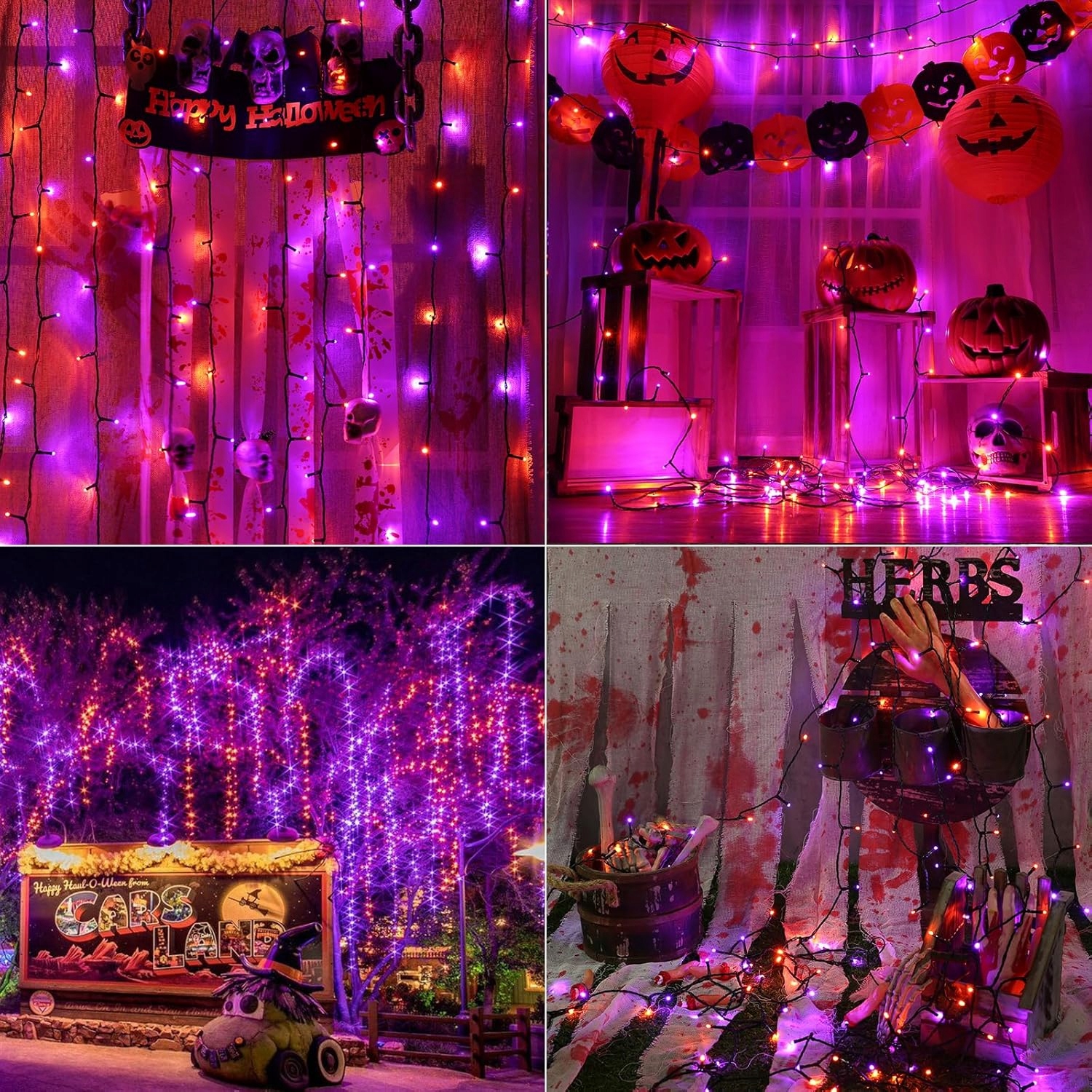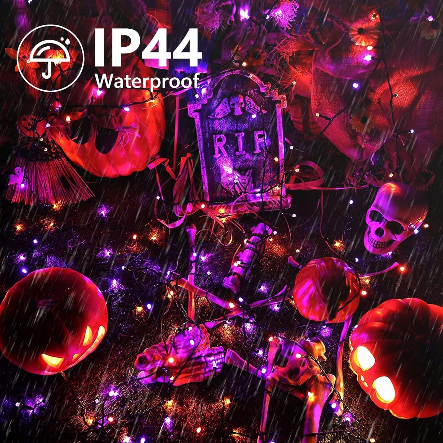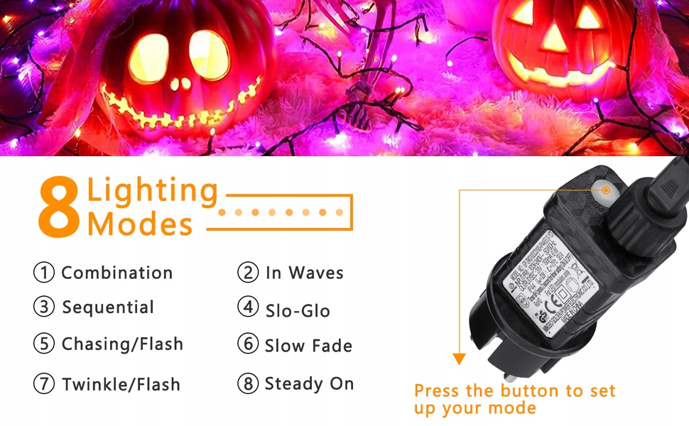 - 8 режимів освітлення: Зовнішній світлий ланцюг на Хеллоуїн має 8 режимів освітлення на вибір: комбінація, хвилі, послідовність, гасло, полювання/миготіння, повільне зникнення, фібриляція, мерехтіння/миготіння та безперервне світло.