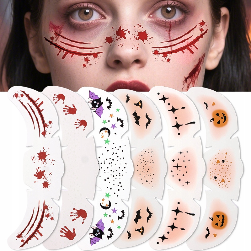 Набір Татуювання на Хеллоуїн у вигляді веснянок та декоративних наклейок для обличчя . Конструкції включають плями крові, руки, кажани, гарбуз, зірки та місяці , що створює унікальний та ефективний макіяж для Хеллоуїна. Продукт підходить для дорослих та дітей як кумедного елемента вбрання та макіяжу.