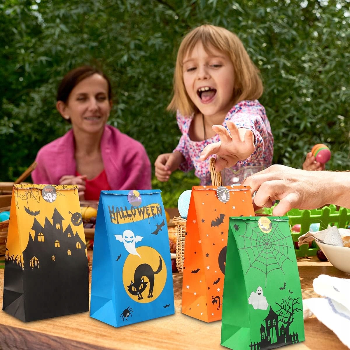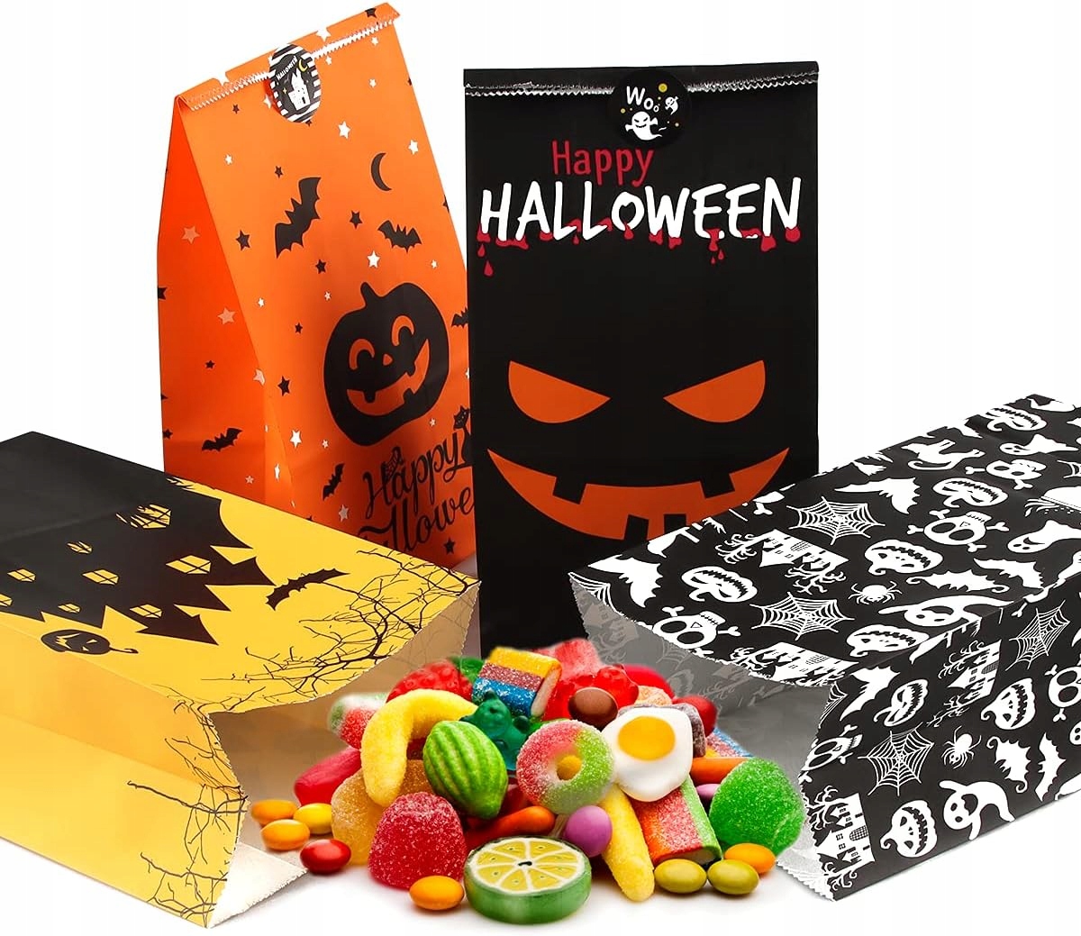 Хеллоуїнські паперові пакети для солодощів 40 штук, 8 візерунків + 48 наклейок