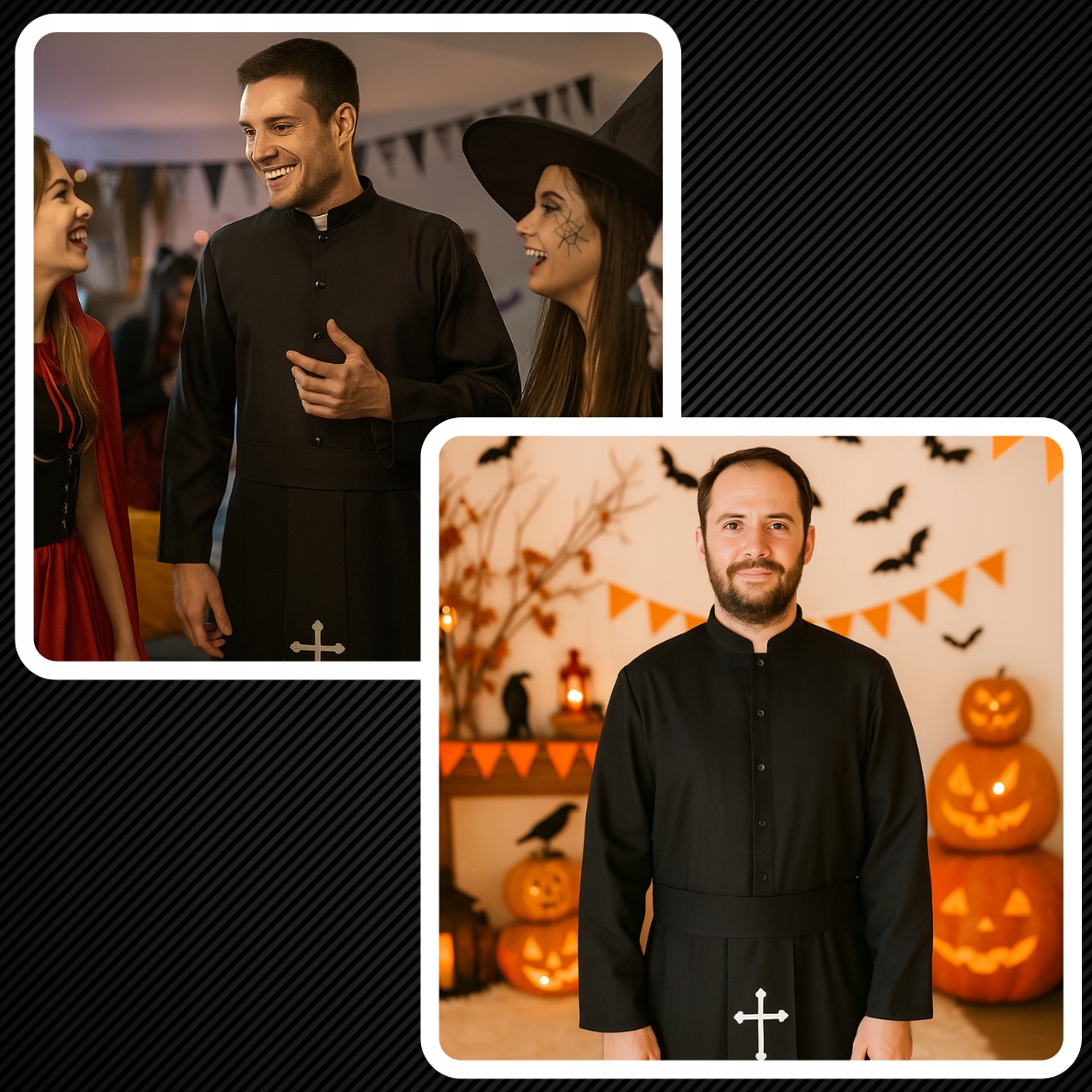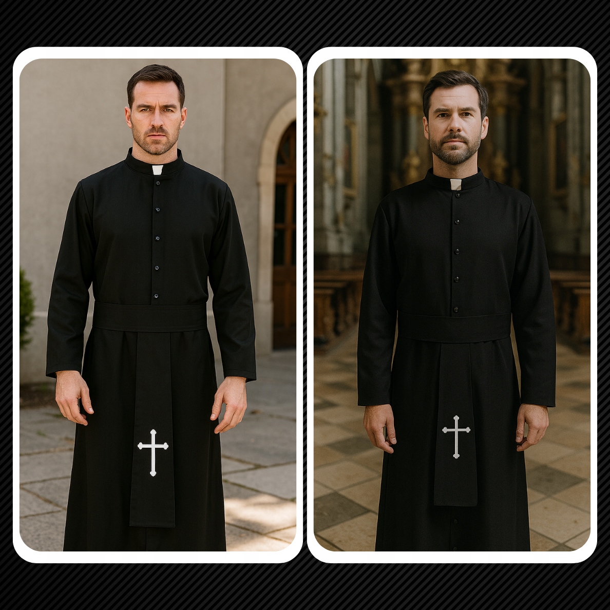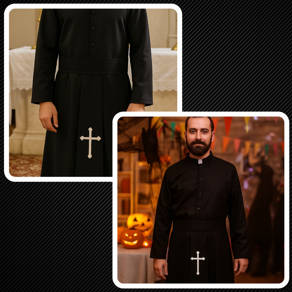➡️ ПОВНА ДИСПОЗИЖА – чорна сутана з декоративним хрестом на поясі – готова маскування. Для ефектного вигляду не потрібні додаткові елементи.