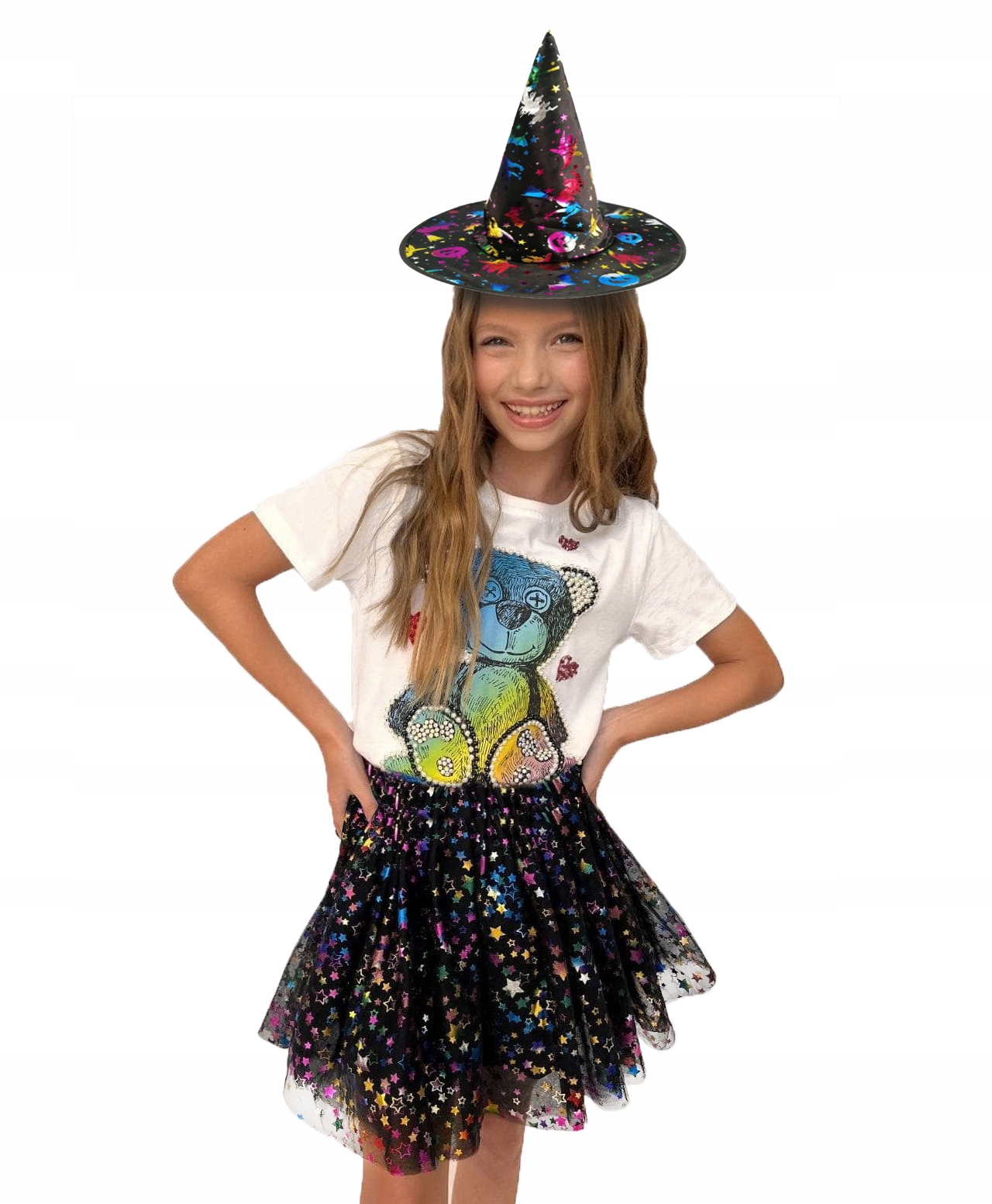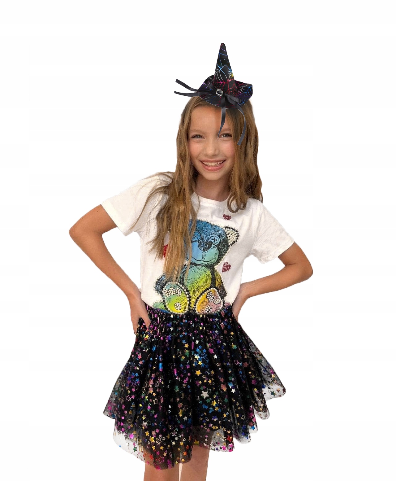 ✨ КАПЕЛУХ ВІДЬМИ - високий чорний стоячий капелюх класичної конічної форми. Прикрашена тими ж голографічними мотивами, що і спідниця та пов’язки, вона є головним елементом вбрання, що надає йому таємничого характеру Хелловіну. Капелюх легкий і стійкий, ідеально вписується в комплект, роблячи кожну дівчину справжньою чарівницею.