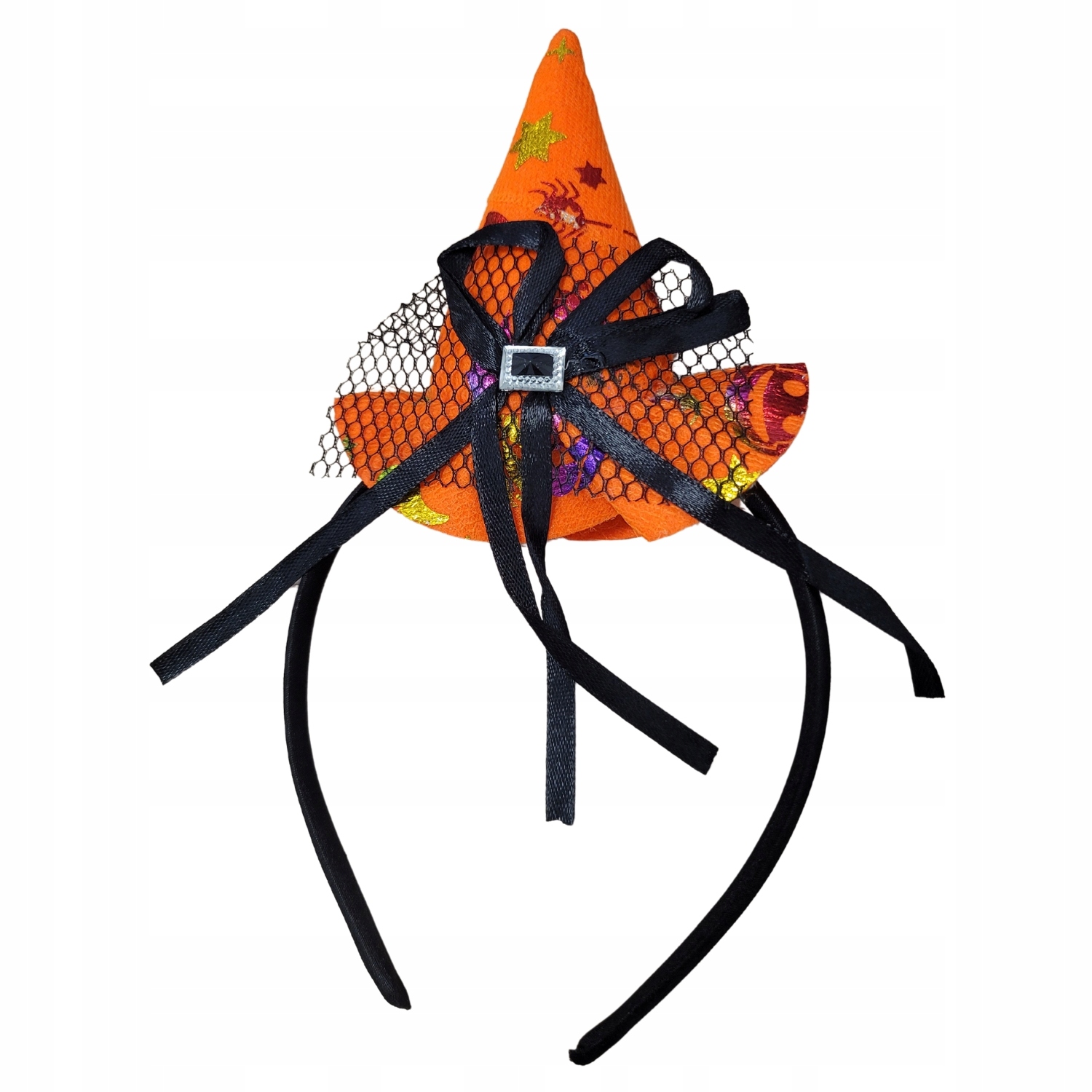 ✨ ДВІ ВІДЬОМСЬКІ КАПЕЛЮХИ - ідеальний вибір залежно від вашого настрою! Одна група має чорний капелюх, а інша – помаранчевий. Обидва капелюхи прикрашені елегантним чорним бантом, декоративною сіткою та голографічними мотивами в тон спідниці. Високі стоячі капелюхи в класичному відьомському стилі додають характеру вбранню, а легкий дизайн пов’язок на голові забезпечує комфорт під час гри.