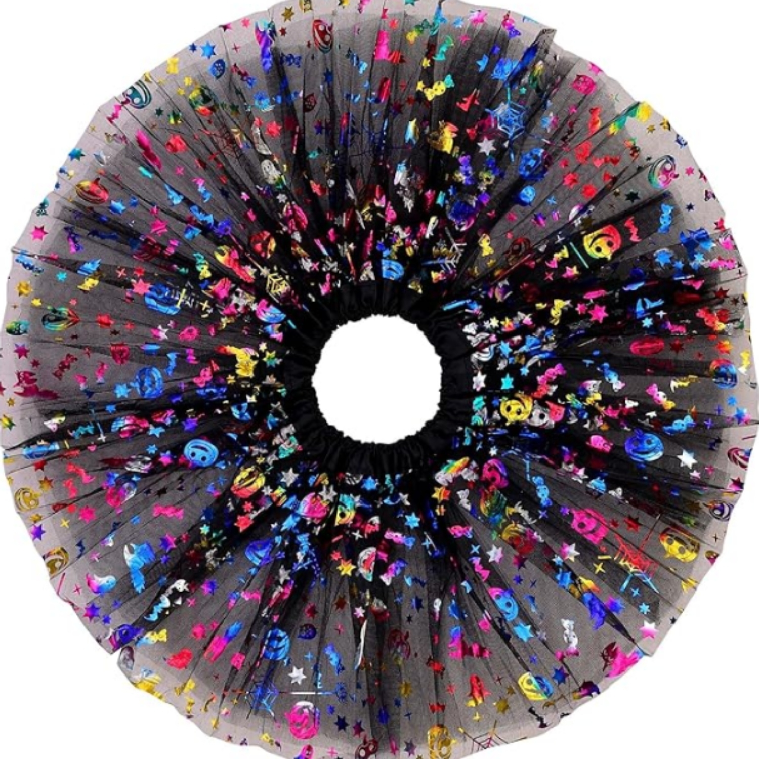 ✨ ЧОРНА СПІДНИЦЯ-ПАЧКА - прикрашена голографічними мотивами Хелловіну: гарбузи, сови, зірки, цукерки, привиди та інші, які переливаються на світлі та надають всьому неповторного сяйва. Спідниця розкльошена, що забезпечує ефектний вигляд, а еластичний пояс гарантує зручну посадку та комфорт під час носіння протягом веселого вечора.