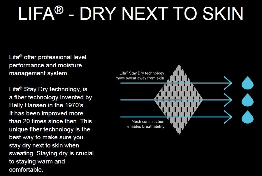 Lifa® Stay Dry - унікальний матеріал Lifa® Stay Dry Technology™ гарантує швидке відчуття сухості під час інтенсивної діяльності. Волокна Lifa® Stay Dry Technology™ негайно відводять вологу при контакті з потом, дозволяючи їй випаровуватися в повітрі або на наступному шарі одягу. Lifa® Stay Dry Technology™ також на 40% легша та на 60% тепліша за поліестер.