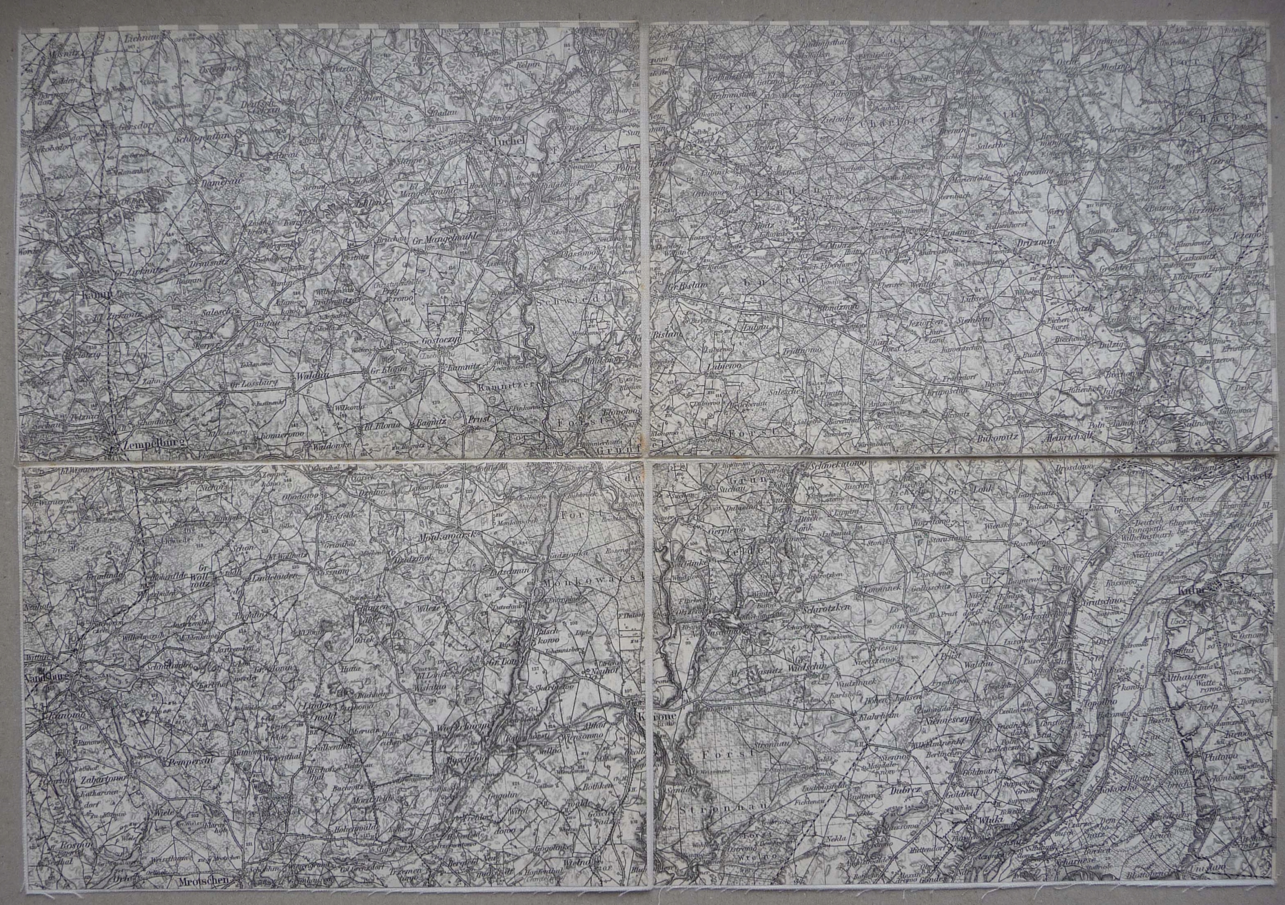 Карта поділена на 4 сегменти, приклеєні до полотна, вирізана врівень з рамою, дуже добре стан.