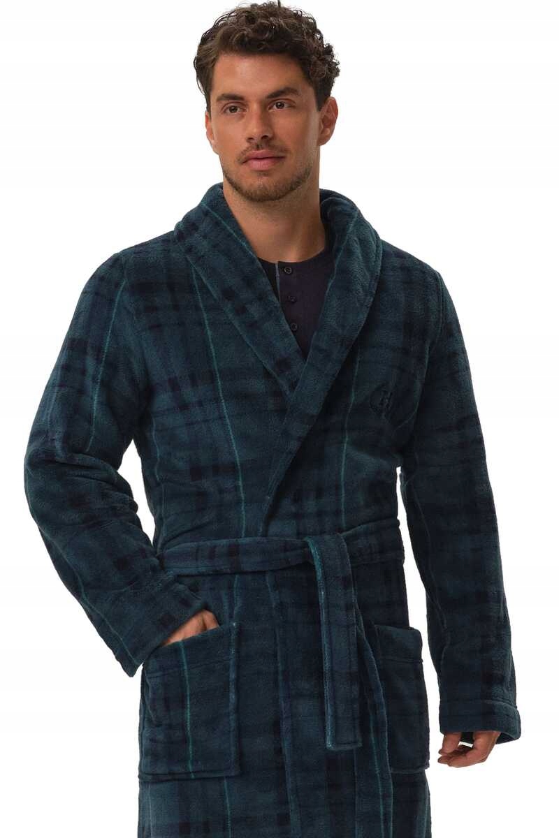 Стильний чоловічий халат Hazel - це пропозиція для джентльменів, які цінують старовинний дизайн та оригінальний дизайн. М'який, блискучий матеріал чудово вбирає вологу після купання і додатково гарантує приємне тепло під час ранкової кави. Елегантний картатий візерунок нагадує про англійську класику, а все це чудово підкреслюють чіткі лацкани на комірі.
