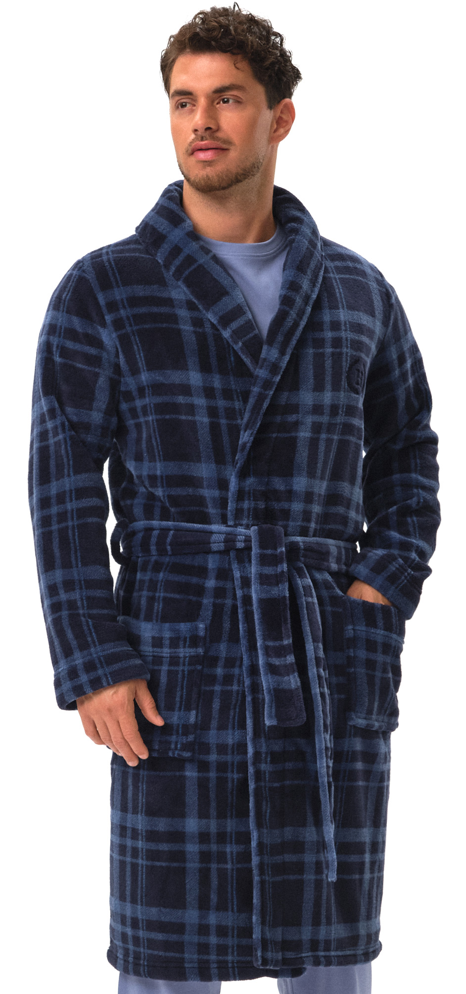 ⭐ елегантний чоловічий халат вражає темно -синім кольором, модною решіткою та приємною на дотик, плюшевою текстурою.
