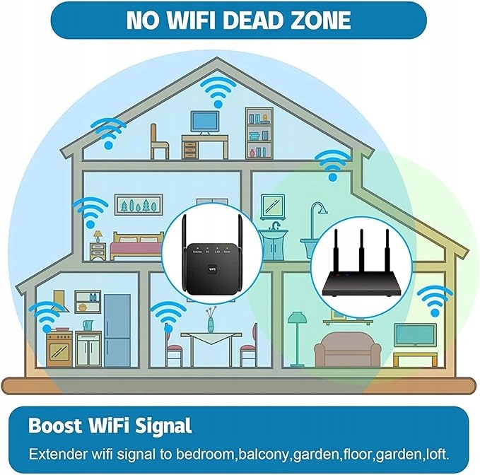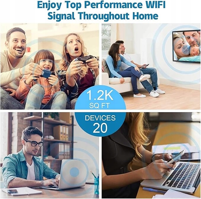 - Wi-Fi Extender Booster із широким охопленням 360° Wi-Fi оснащено обертовою антеною з високим коефіцієнтом посилення 4*3dBi. 360° допомагає краще поширити сигнал WiFi у важкодоступних місцях і усунути глухі кути WiFi, наприклад кімнати. кухня, ванна кімната, гараж і підвал тощо.