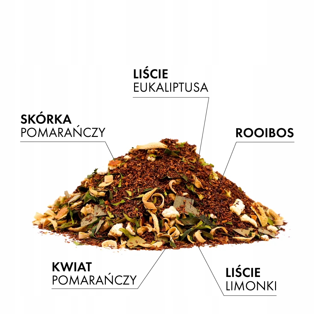 До складу входить висушений червоний кущ з додаванням цедри апельсина, квітів апельсина, листя липи та евкаліпта. Листя евкаліпта є перш за все джерелом ефірної олії для місцевого застосування або інгаляцій. Властивості зеленого дерева незамінні. Він підтримує організм у боротьбі із застудою та має розслаблюючу та розслаблюючу дію. Покращує стан зубів, знімає біль і живить суху шкіру. Листя евкаліпта, як і сам ройбуш, є чудовим джерелом антиоксидантів. Дубильні речовини, приховані в листі та корі евкаліпта, мають антибактеріальну, протизапальну та противірусну дію. Крім того, вони мають відхаркувальну та зігріваючу дію.
