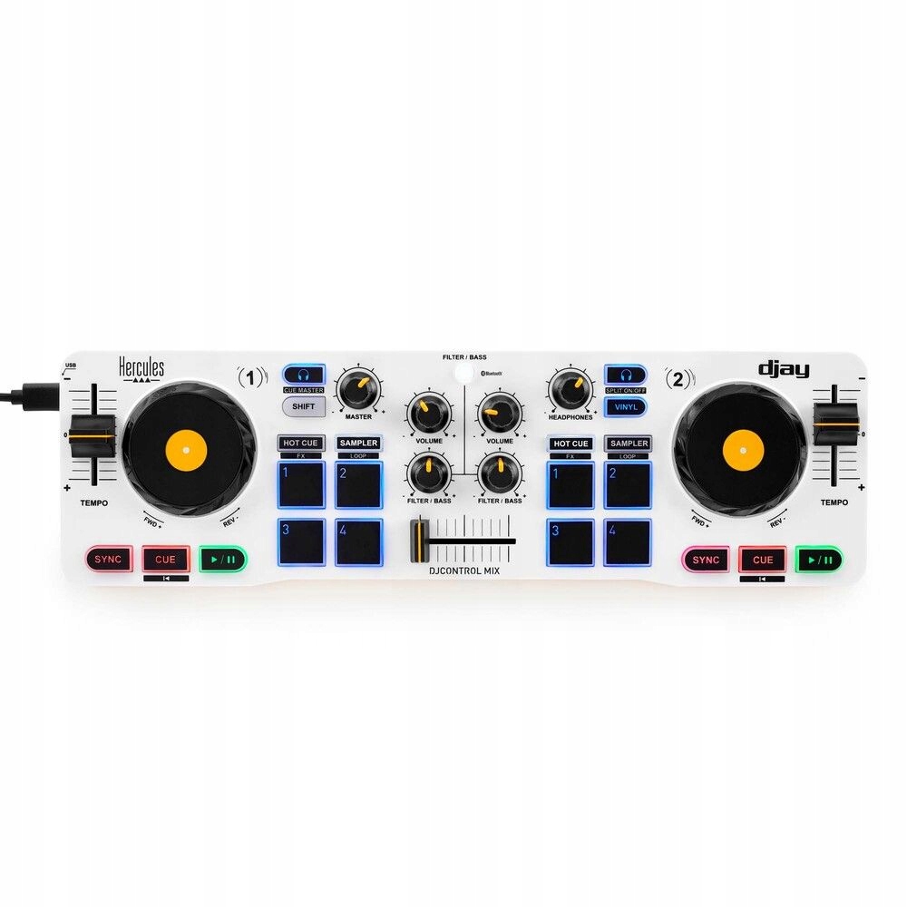 HERCULES DJ CONTROL MIX це бездротовий DJ-контролер, спеціально розроблений для використання зі смартфонами iOS або Android. Він підключається до смартфону за допомогою технології Bluetooth Low Energy і дозволяє керувати програмою djay.