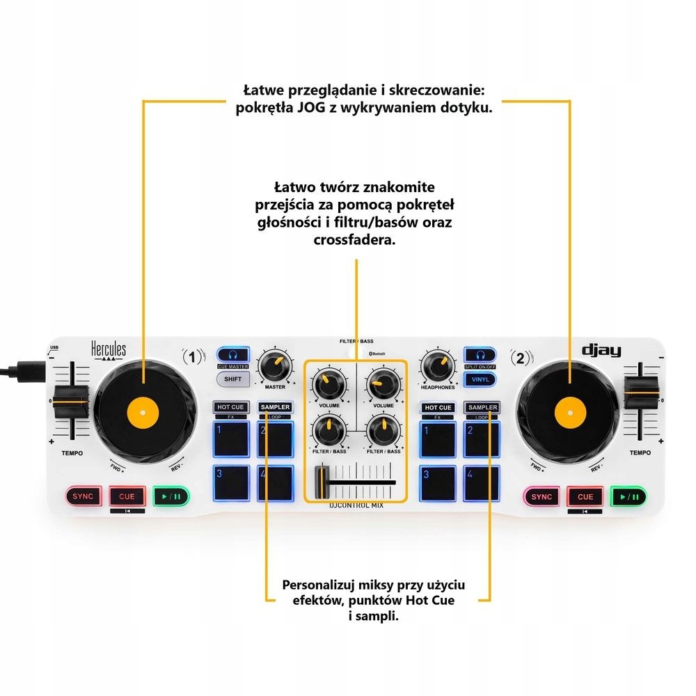- Колеса JOG для мікшування та скретчингу, а також фейдери, ручки та педи: мікшуйте, як на повнорозмірному DJ-контролері!