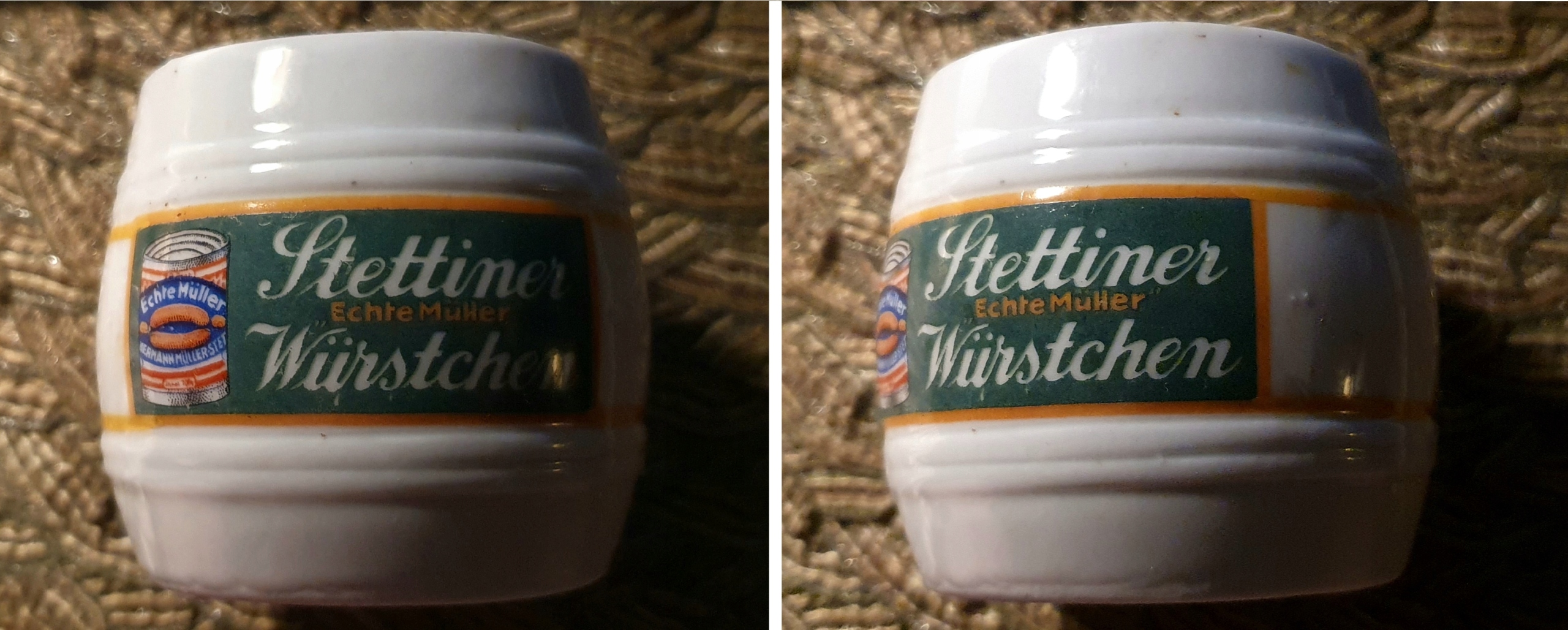 Пропоную дуже рідкісну річ, пов'язану з харчовими продуктами в довоєнному Щецині, а саме порцеляновий контейнер для ковбаси, з написами на контейнері; Stettiner Wurstchen - щецинські ковбаси, Echte Muller - Real Muller, виробник - Hermann Muller - Stettin, загалом гарний стан, без пошкоджень та вм'ятин, місткість. - 70 мл.