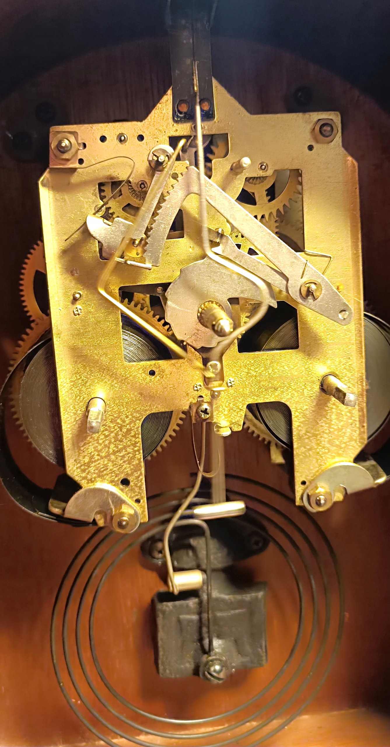 Дуже гарний звук спірального гонгу, він б'є півгодини та кількість годин. Ключ у комплекті.