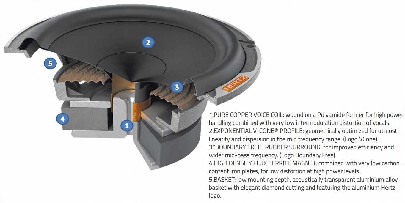 4. Діафрагма з повністю конічним профілем, виготовлена з пресованої маси V-cone з бавовняними волокнами, що поєднує в собі жорсткість і легкість для широкої частотної характеристики. Профіль конуса геометрично оптимізований для максимальної середньої лінійності та дисперсії.