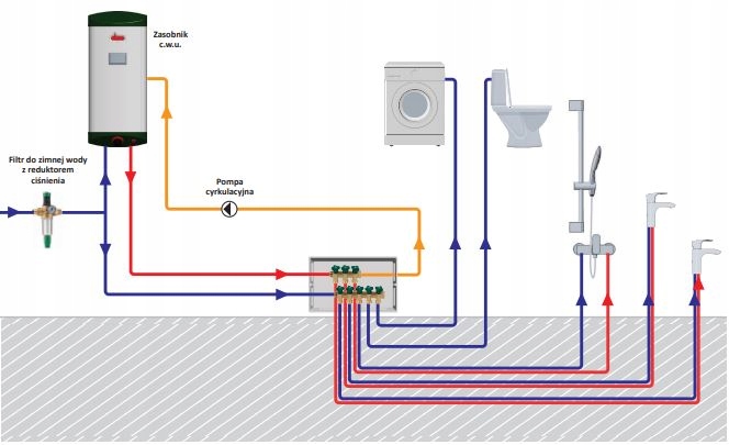 Кожна окрема точка живиться безпосередньо з трубою з колектора, нерозумна арматура між заданою точкою та дистриб'ютором.