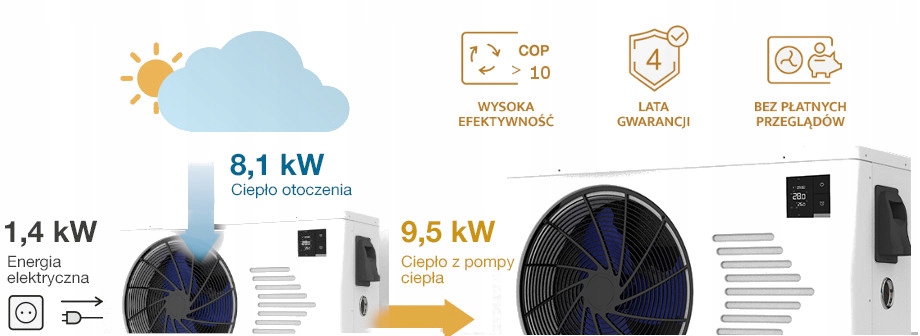 Спеціальні структурні розчини були розроблені для прямого з'єднання води без необхідності використання, серед інших додаткових теплообмінників. Це забезпечує швидку та неускладнену збірку та особливо високу ефективність роботи. Комфортне використання басейну може тривати не 1-2 місяці, а навіть 5 місяців на рік. Інверторна версія теплового насоса додатково характеризується плавною регуляцією ефективності, підвищенням ефективності та зниженням обсягу роботи.