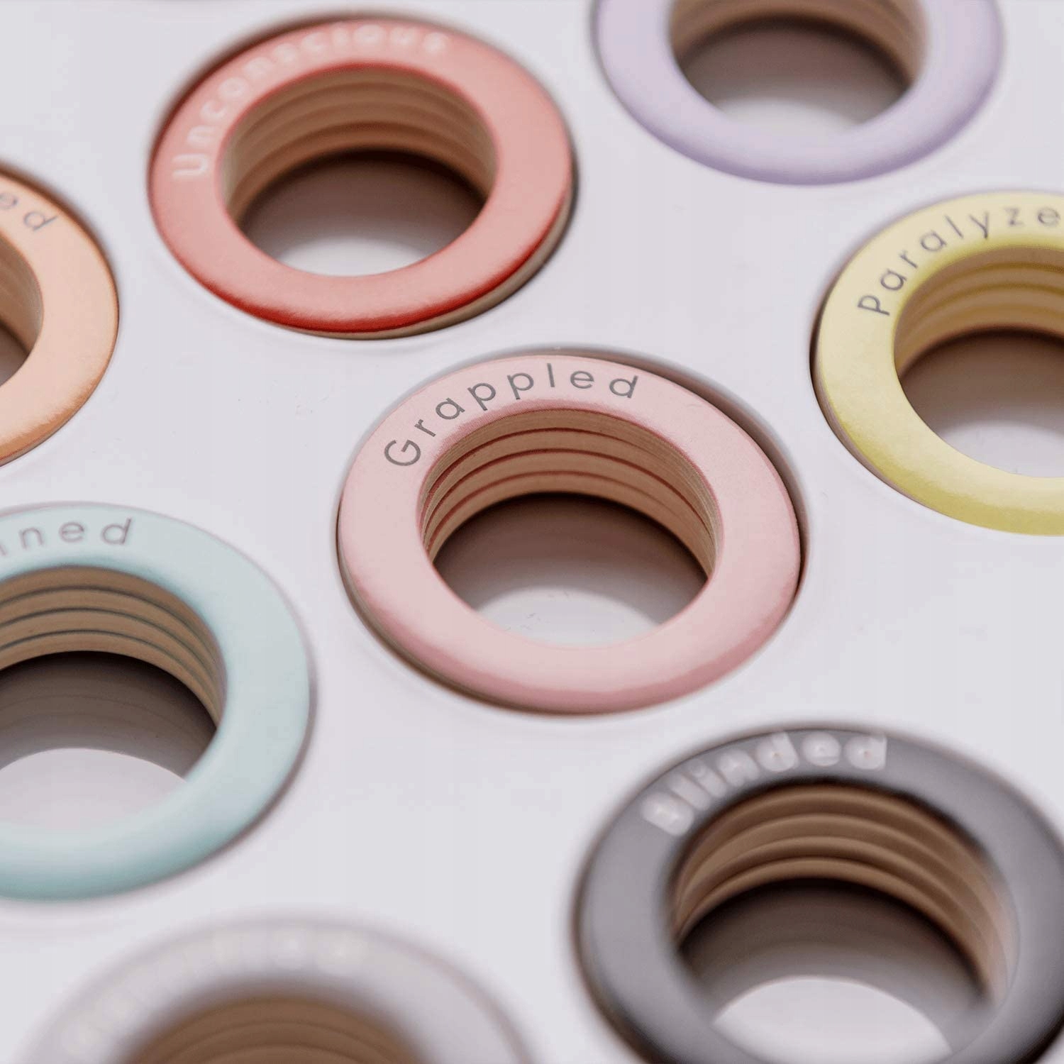 - 80 кілець: є 80 кілець. 68 кольорових кілець: 17 різних умов унікальних кольорів по 4 кільця в кожному. Кожне кольорове кільце має статус, надрукований на одній стороні, а інша сторона сухо стирається та налаштовується. 12 кілець порожні, стираються насухо та повністю налаштовуються.