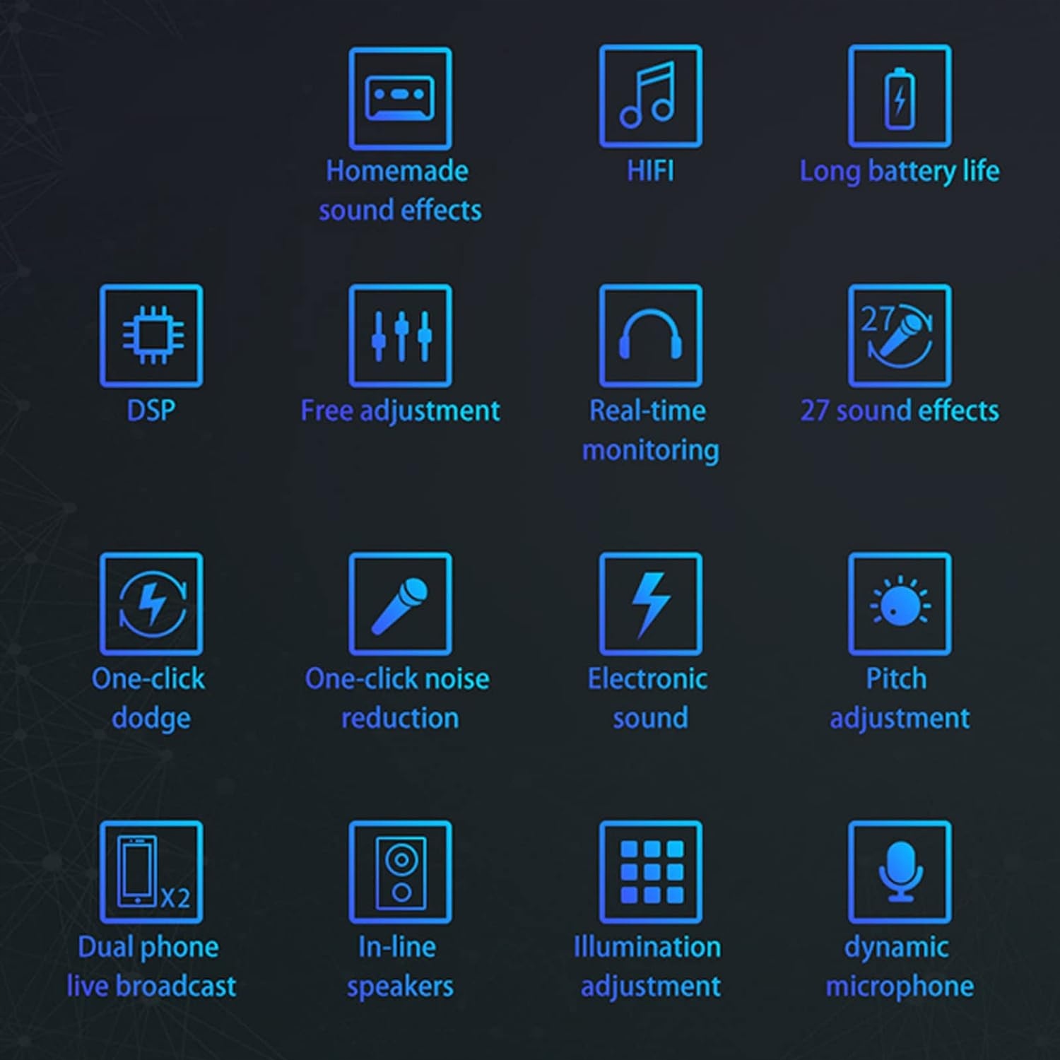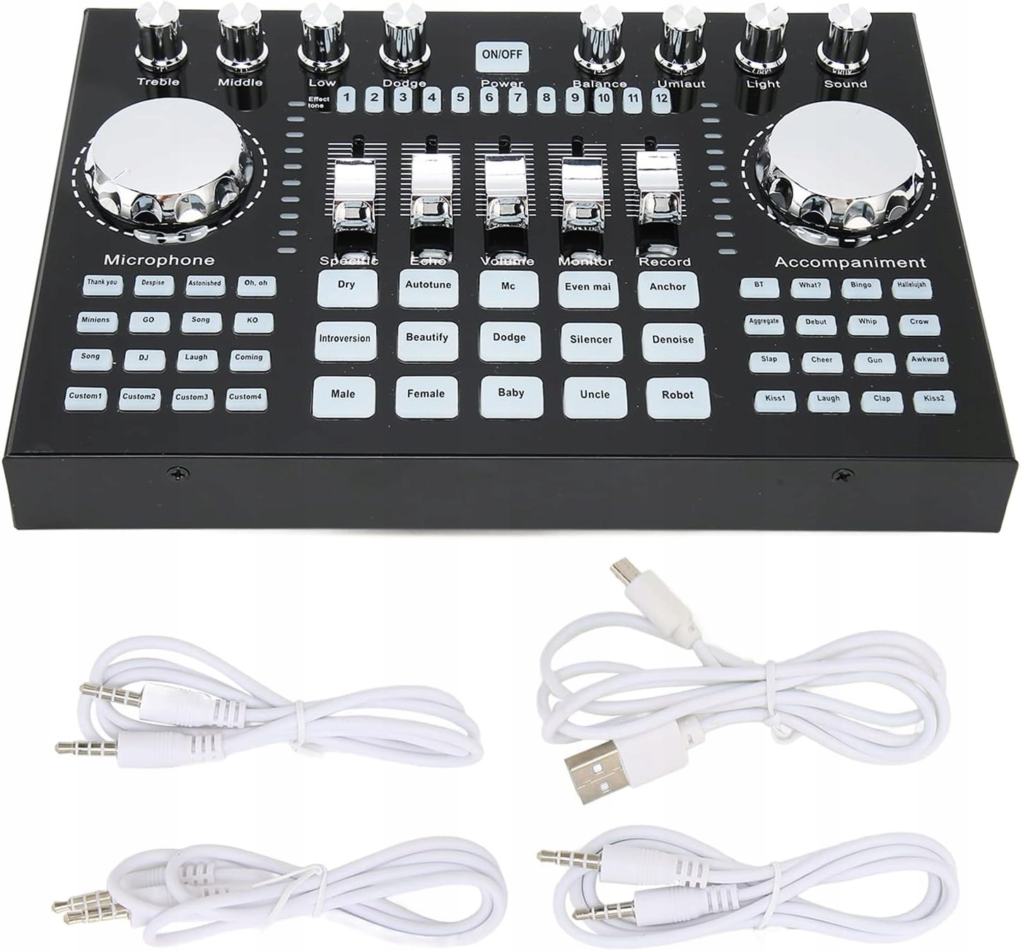 - Велика ручка: Live Звукова карта – це велика ручка та повзунок регулювання, численні звукові ефекти, сліпуче світло та може бути подвійним живим телефоном. Ідеально підходить для трансляції, караоке.