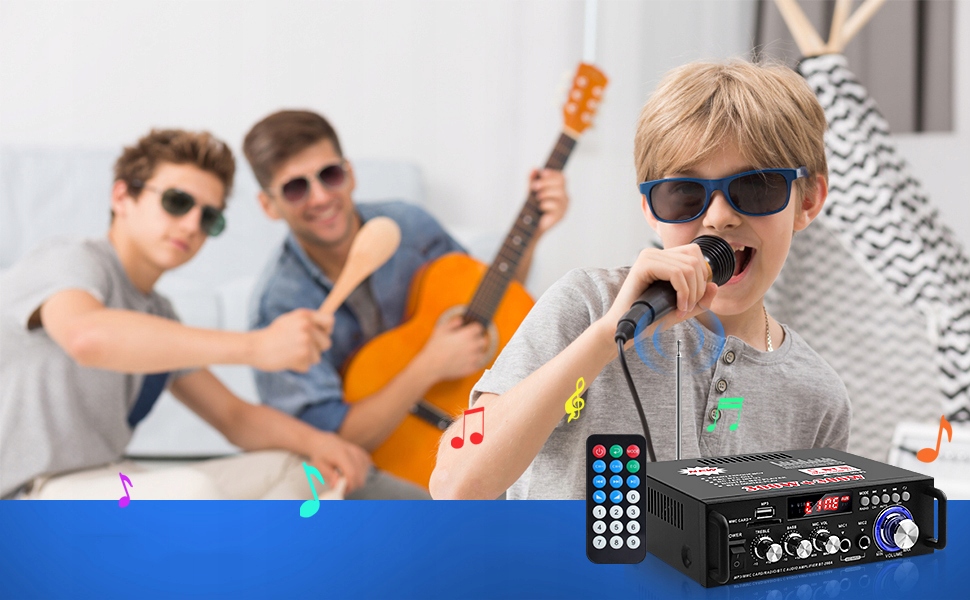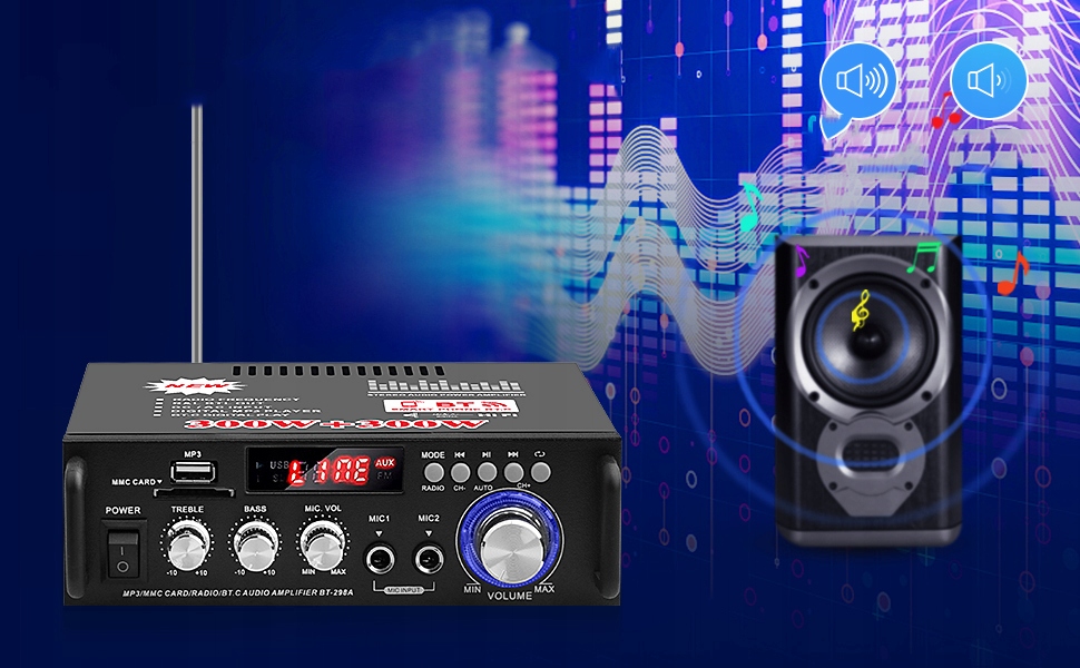 🎵antentic Hifi Audio підсилювач: стерео, з основним об'ємом, регулюванням висоти та регулюванням басів, регульованим аналогом для контролю підсилювача. Грайте в музику з усього світу і отримайте справжній звук HIFI. Це дозволяє грати улюблену музику. Щоб безпосередньо грати музику, все, що вам потрібно зробити, - це вставити SD -карту або USB -флеш -пам'ять. Він сумісний з iPhone, Android, мобільним телефоном, iPad, планшетним ПК, комп'ютером ПК тощо. Ви та ваші друзі насолоджуєтесь караоке. СТЕРЕО ФМ підтримка передачі. Він може бути підключений до одного або двох мікрофонів для використання вдома або як система караоке. 🎵 🎵 🎵. Він також має USB -вхід. Це означає, що ви можете передавати музику, як вам подобається, насолоджуватися якісною музикою, яка підходить для домашнього аудіо обладнання, автомобіля, всіляких вечірок, сімейних зустрічей, танцювальних занять, бару, ресторанів, нічного клубу тощо. Він забезпечує 300 Вт х 2 (максимальна вихідна потужність 600 Вт), забезпечує відмінну якість звуку, чистий та детальний звук. Інфрачервоний пульт дистанційного керування, відмінний доступ та спілкування між людиною та підсилювачем. Його операція проста і зручна для користувачів, тож ви будете любити його з першого моменту.
