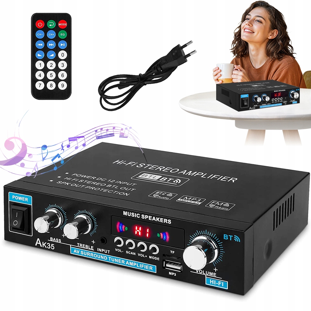 З РК-дисплеєм із підсвічуванням. Пульт дистанційного керування має бути спрямований до екрана дисплея підсилювача потужності та тримати його під перпендикулярним кутом до екрана дисплея, потім натиснути кнопку, і він запрацює. Пакет із FM-антеною, режим FM може зберігати понад 20 станцій, ви можете слухати різні радіостанції, такі як спорт, музика, політика, розваги, дорожній рух тощо.