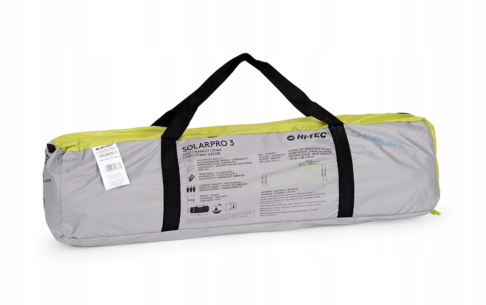3-місний намет Solarpro 3 має купольну структуру. Це рішення є ідеальним вибором для кемпінгу, коли вам потрібна більша корисна площа та стійкість на вітрі. Покривало, яке використовується в цьому наметі, виготовлено з міцної поліефірної тканини з водонепроникністю 3000 мм водяного стовпа. Намет також має міцну підлогу з поліестеру. Перекриття стаціонарно заварене. Вся конструкція має двошарову структуру. Флайшет розміщений на дугах з міцного та легкого скловолокна. Міцні кріпильні шпильки та відтяжки з боків забезпечують стійкість намету. Виріб, створений брендом Hi-Tec, відрізняється тим, що має значний обсяг простору всередині. Завдяки цьому там можуть комфортно спати чотири людини і одночасно зберігати своє спорядження. Намет дуже малий у складеному вигляді та легкий з огляду на розміри, тому рекомендований людям, яким доведеться його часто переміщати.