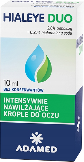 Hialeye Duo інтенсивно зволожує очні краплі, які забезпечують миттєве полегшення та тривалий зволожуючий ефект. Продукт має захисні та антиоксидантні властивості та підтримує регенерацію поверхні очей. Краплі мають нейтральний рН, не містять консервантів і підходять людям з чутливими очима та користувачам контактних лінз. Препарат знімає свербіж, печіння, подразнення, тимчасове погіршення гостроти зору та відчуття стороннього тіла в оці.