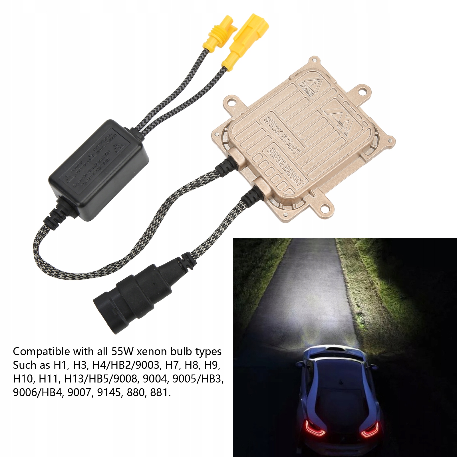 Функція: 1. Широка сумісність: сумісна з усіма типами 55 W ксенонових цибулин, таких як H1, H3, H4/HB2/9003, H7, H8, H9, H10, H11, H13/HB5/9008, 9004, 9005/HB3, 9006/HB4, 9007, 9145, 880, 881. модуля ксенонового контролю має анти -вібрацію, антиколілітану електромагнітну та випромінювальну функцію.
