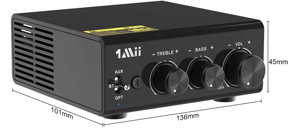 - Перемикання низьких і високих частот. Оновлений цифровий підсилювач Bluetooth 1Mii B08S має регулятори низьких і високих частот і гучності для бездоганної роботи та якісного живого звуку.
