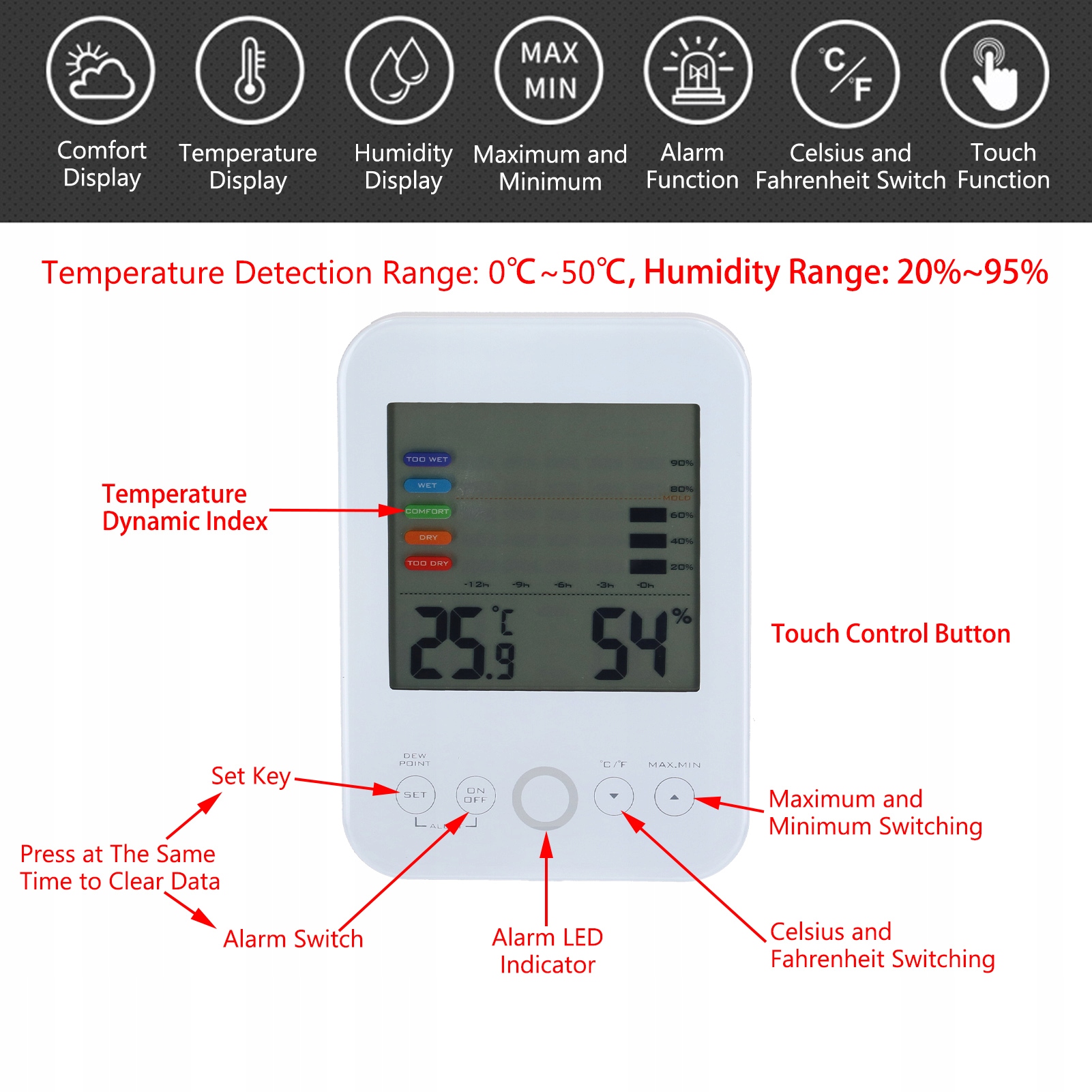 1. Висока драбина: забезпечує високу доктрину, цей монітор температури та млявості може виміряти та відображати фактичну дату з невеликою я.