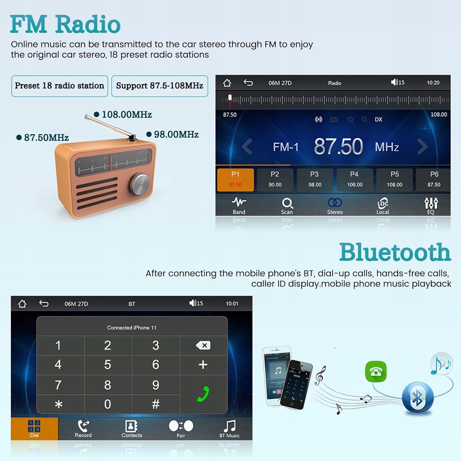 - Bluetooth/FM-радіо: автомобільне радіо з екраном Carplay 1din підтримує з’єднання Bluetooth, дзвінки без використання рук і музику Bluetooth, а також завантаження книг на ваш мобільний телефон. Автомагнітола підтримує прослуховування FM-радіостанцій і має 18 місць пам'яті. Таким чином ви можете слухати улюблені радіостанції чи пісні за кермом