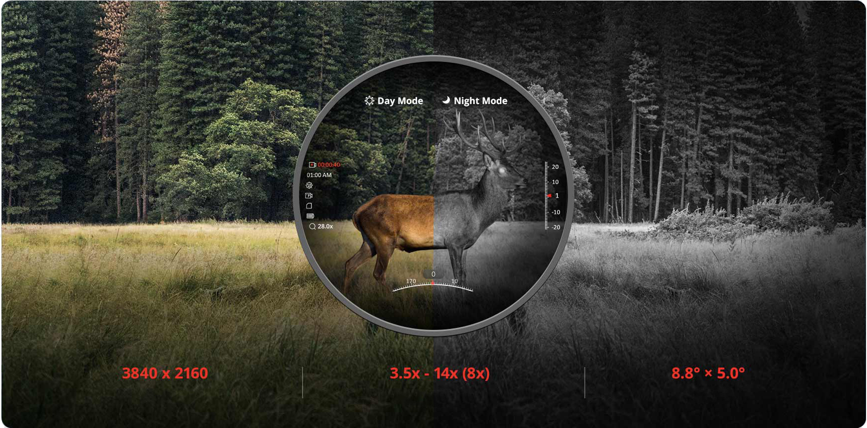 - Кутове поле зору: 8,8° x 5,0° / 15,3 м x 8,6 м @ 100 м
