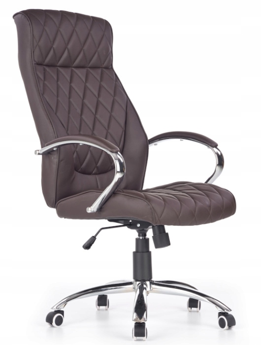 Сучасне та елегантне офісне крісло - кабінет. Профілійний спинка з підголівником. Металеві, хромовані підлокітники з м'якими м'якими накладками. Верхова основа, виготовлена з металу, хром. М'який еко-шкірка. Внутрішня частина стьобаної оббивки - підкреслює сучасний стиль.