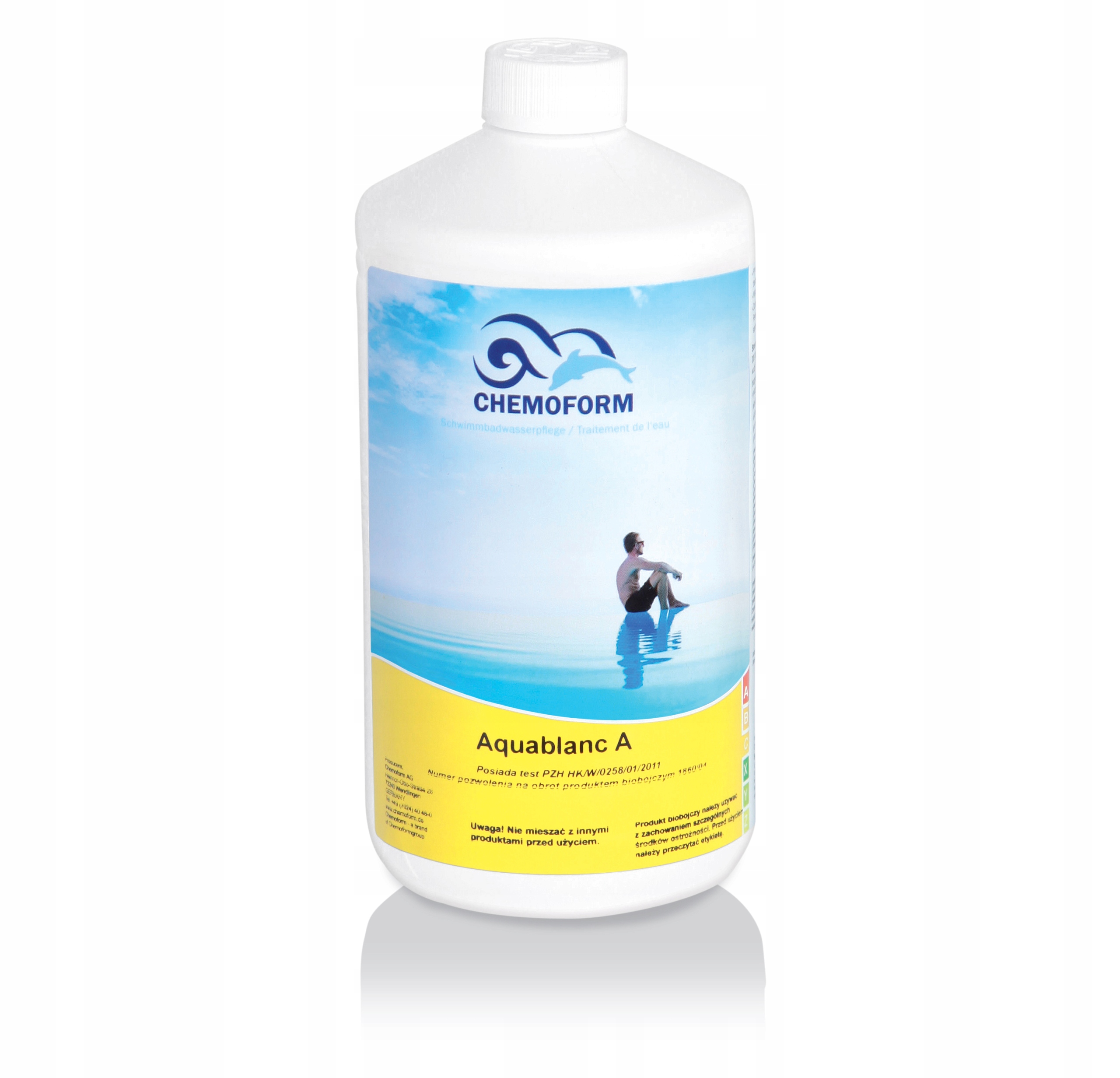 Aquablanc A - Високоефективний засіб для тривалої дезінфекції води кисневим методом (не містить хлору), містить катіонні полімери, що підтримують окислювальну дію кисню та мають бактерицидні, водоростеві та фунгіцидні властивості. у басейнах, джакузі, гідромасажних ваннах і спа .