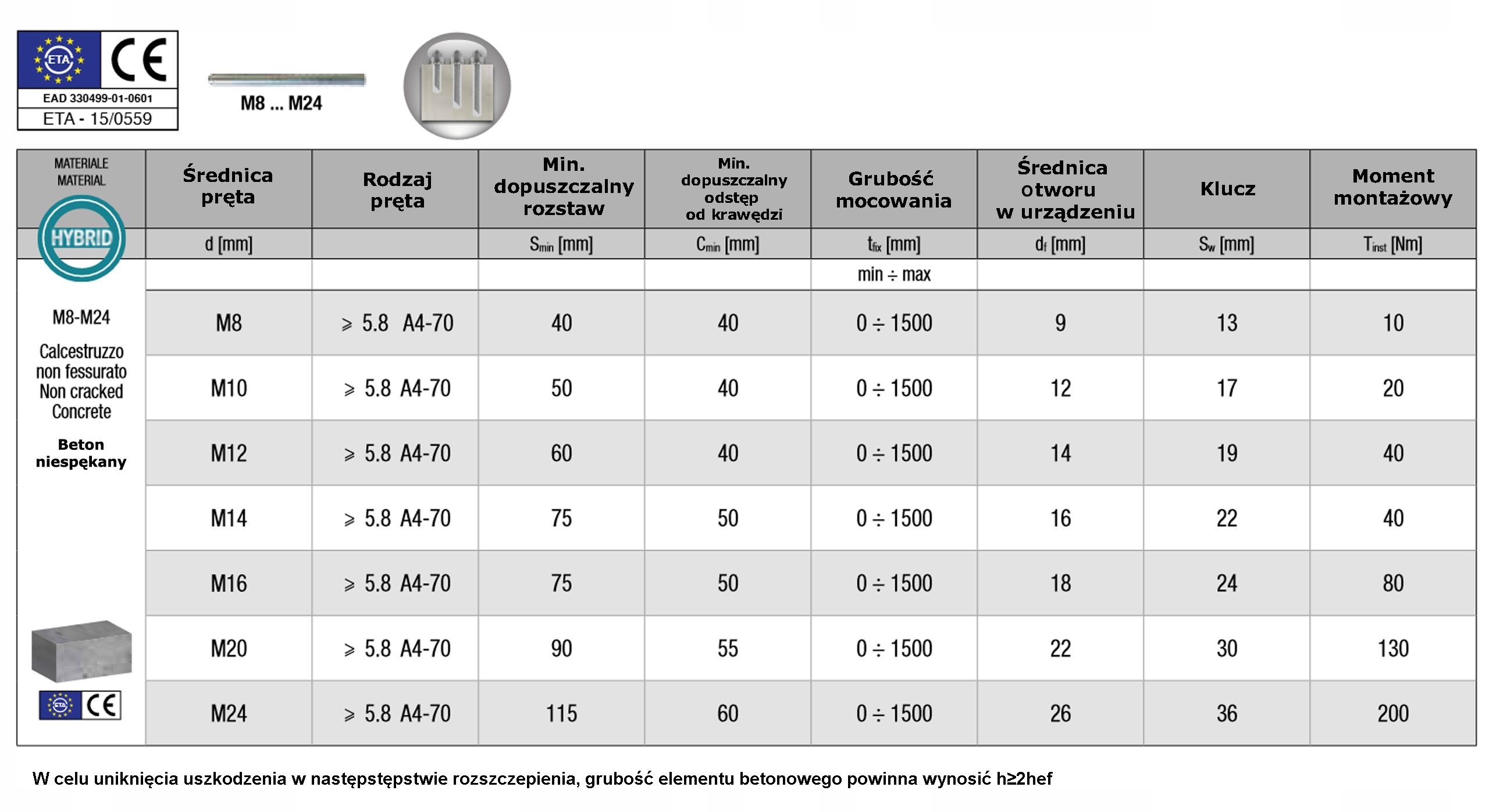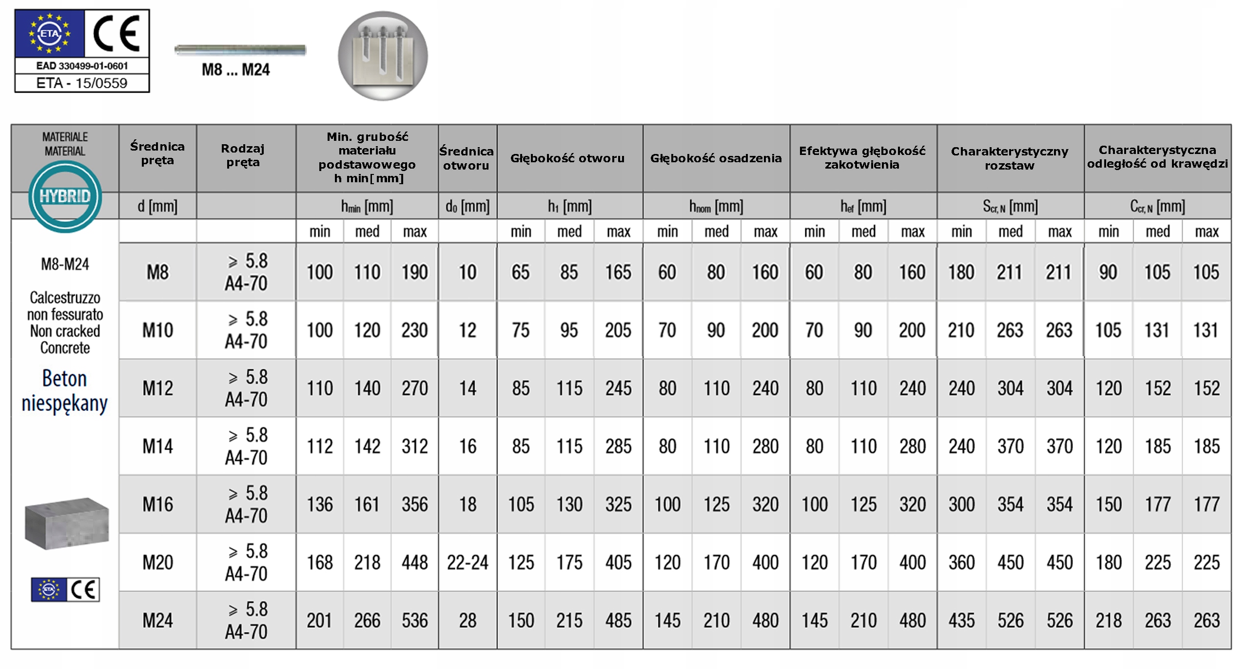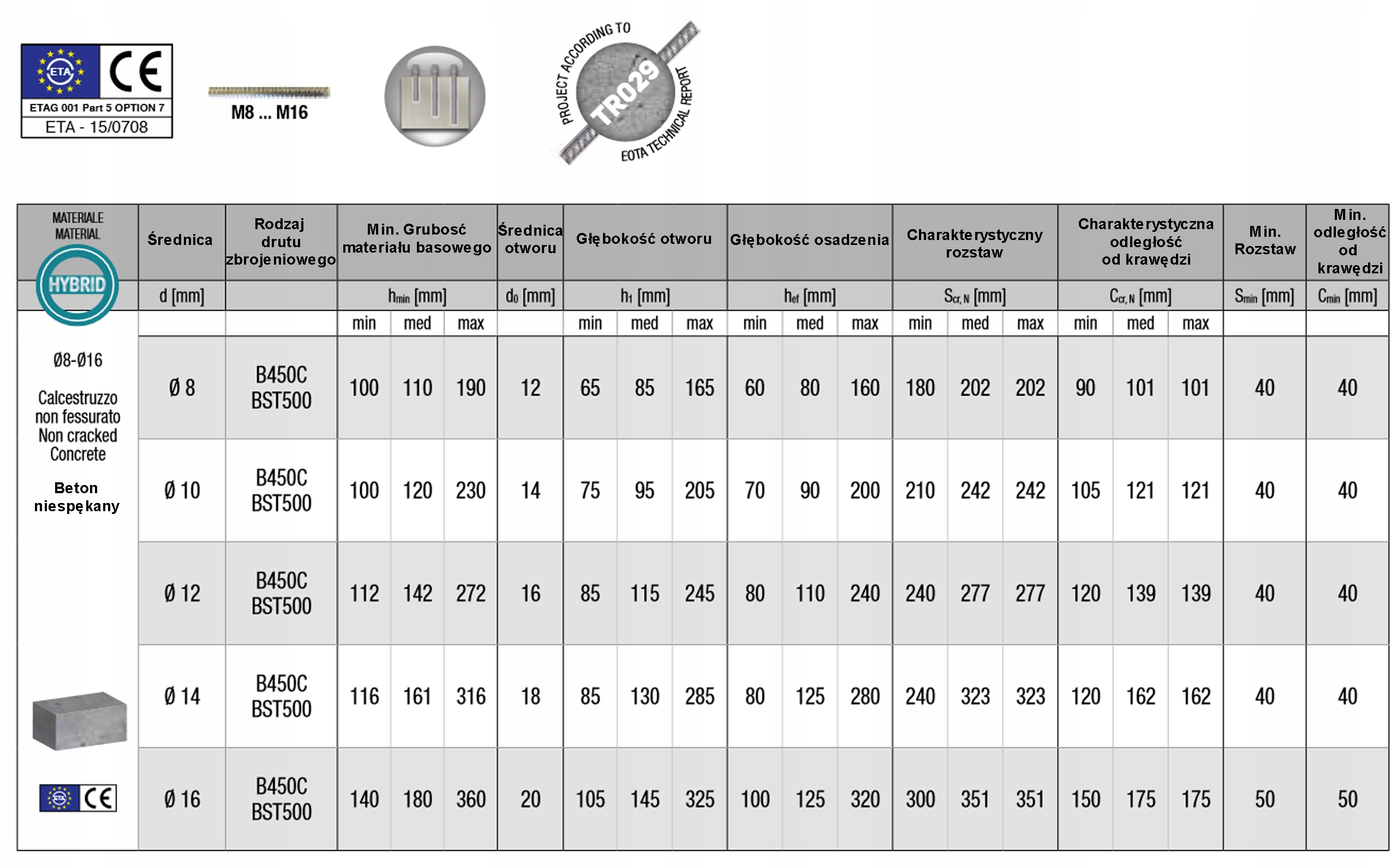 - Схвалені кріплення в бетоні без тріщиндля арматурних стрижнів від Ø8 мм до Ø16 мм.