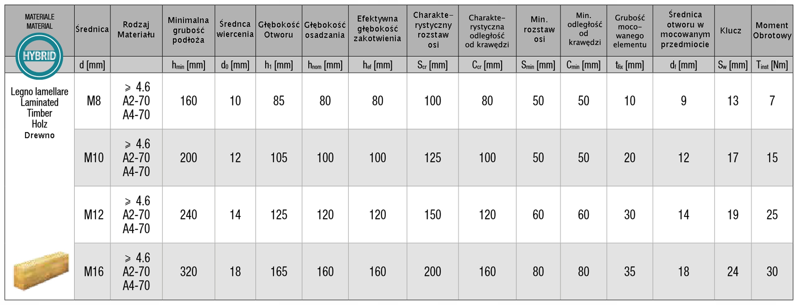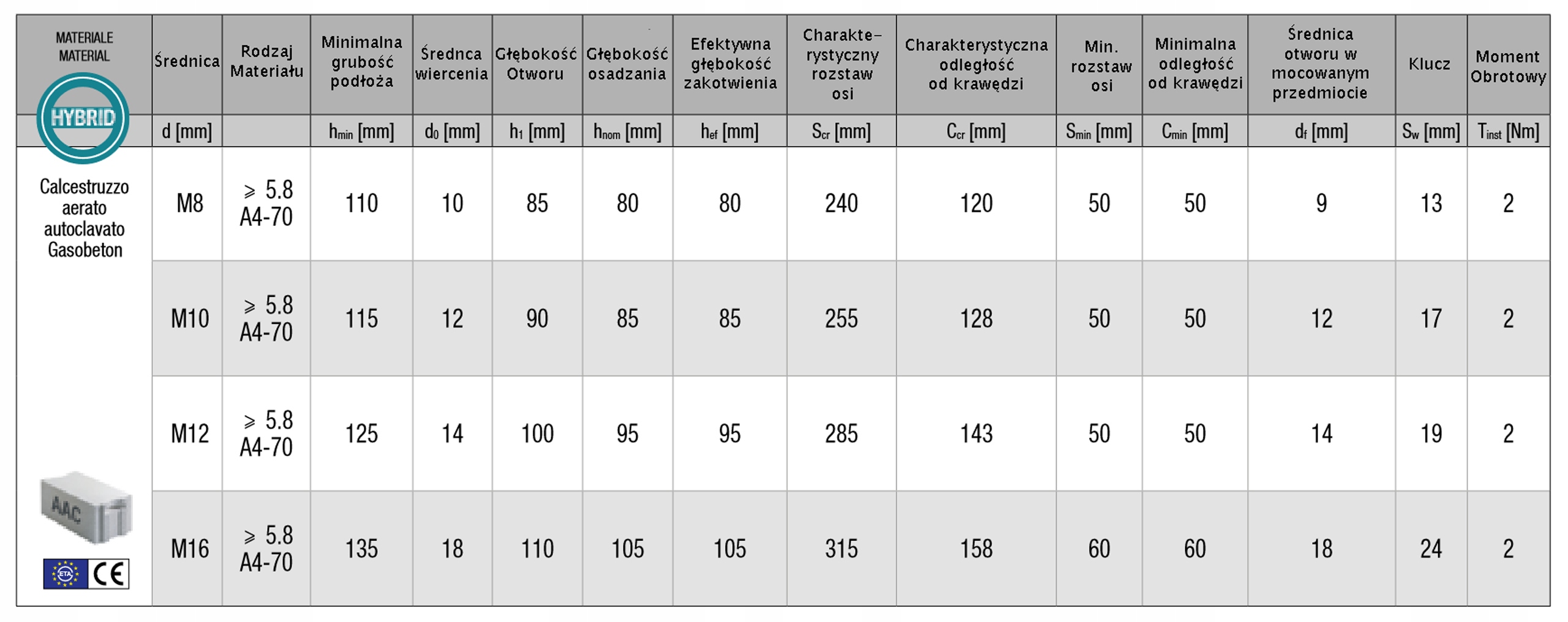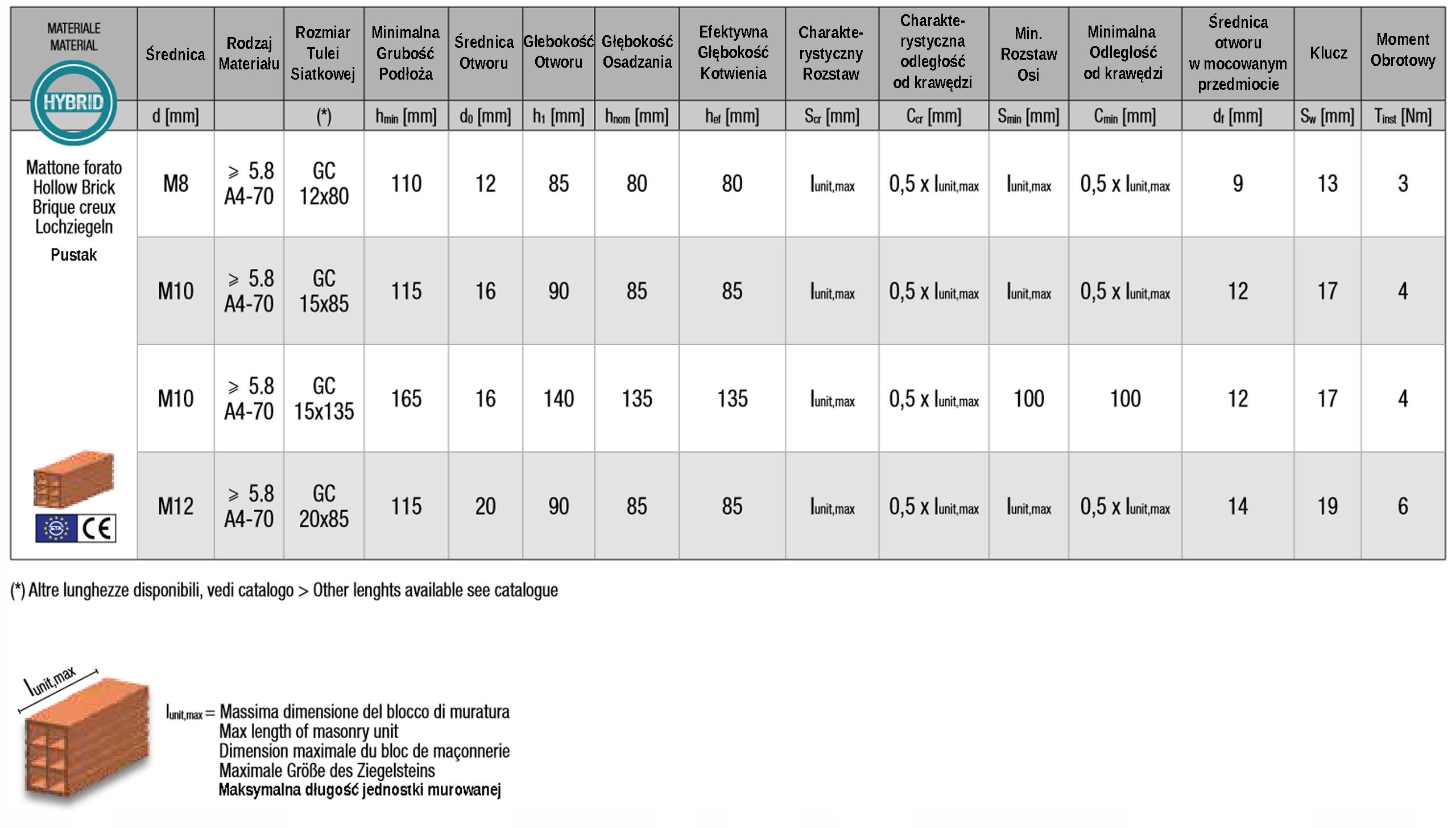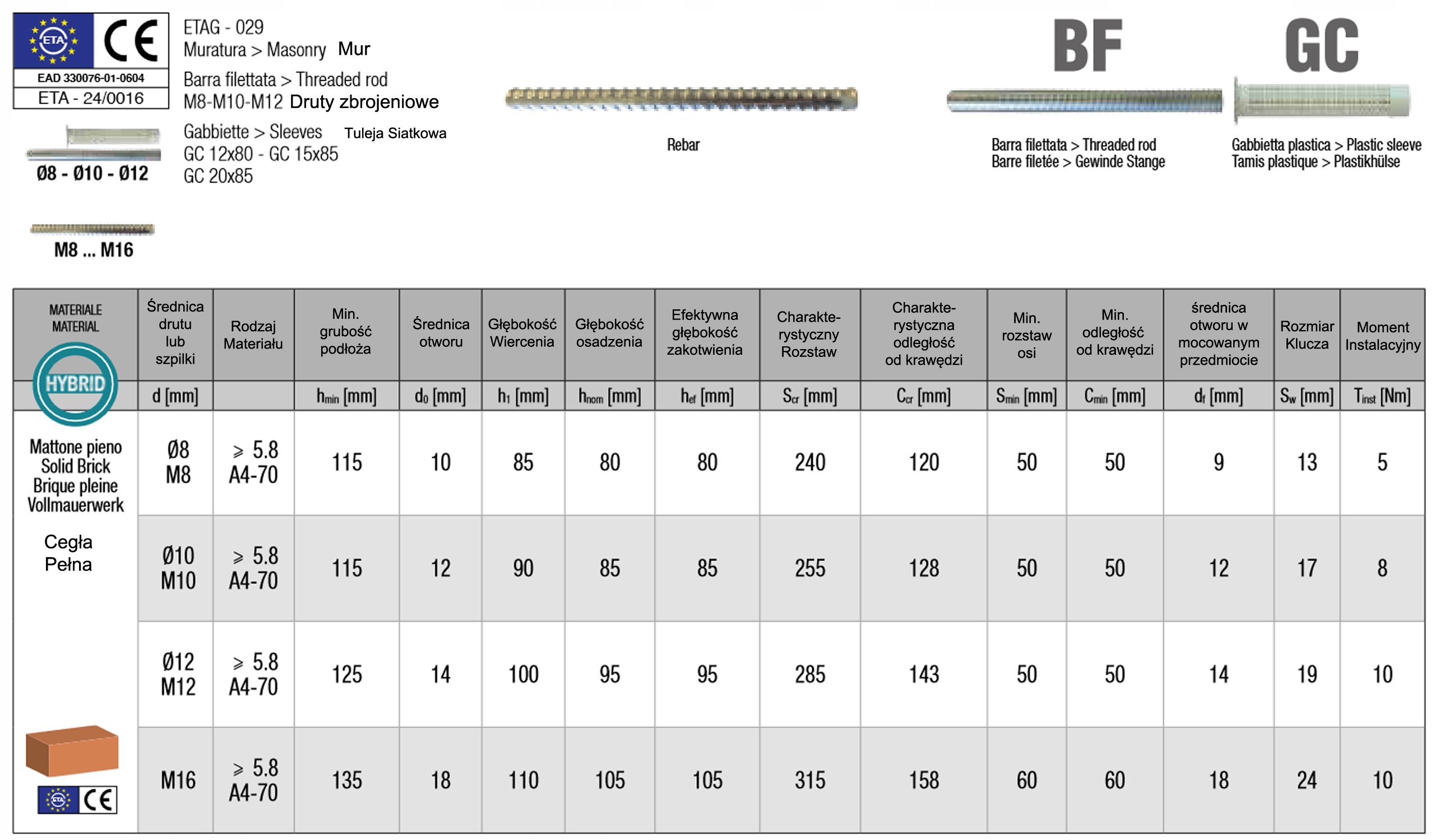 - Схвалені кріплення в цегляній кладці (суцільна цегла, цегла та порожниста цегла, поротерм, газобетон для прутків Від М8 до М16,