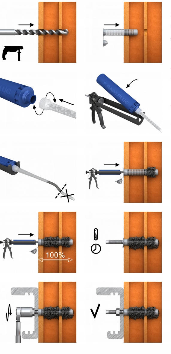 7. Одразу після дозування смоли помістіть стрижень в отвір обертальними рухами. Видаліть непотрібну кількість смоли, яка витекла з отвору, і зачекайте відповідний час, щоб смола схопилася.