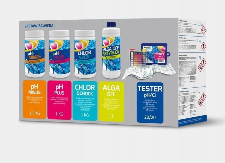 Набір хімії басейну містить 5 продуктів, які допоможуть вам зберегти ваш пул в ідеальній чистоті та гігієні.