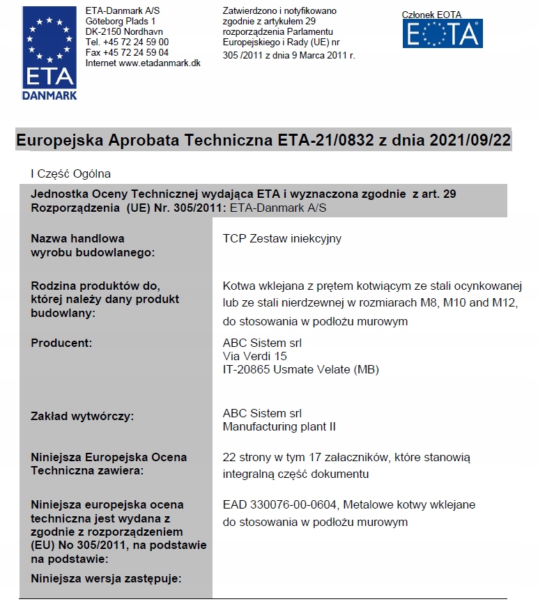 - Європейський технічний сертифікат ETA для монтажу в кам’яну основу