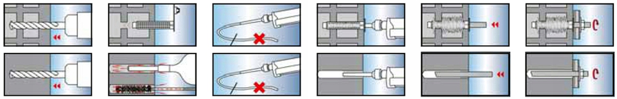 Увага!!! перші 10 см маси, що виходить із змішувача, непридатні для використання і повинні бути викинуті. При установці в порожнисту цеглу або цеглу з порожніми проміжками спочатку необхідно вставити перфоровану втулку. Після закачування розчину вставте фіксуючий елемент, повертаючи його. Після закінчення часу застигання з’єднання готове до повного навантаження.