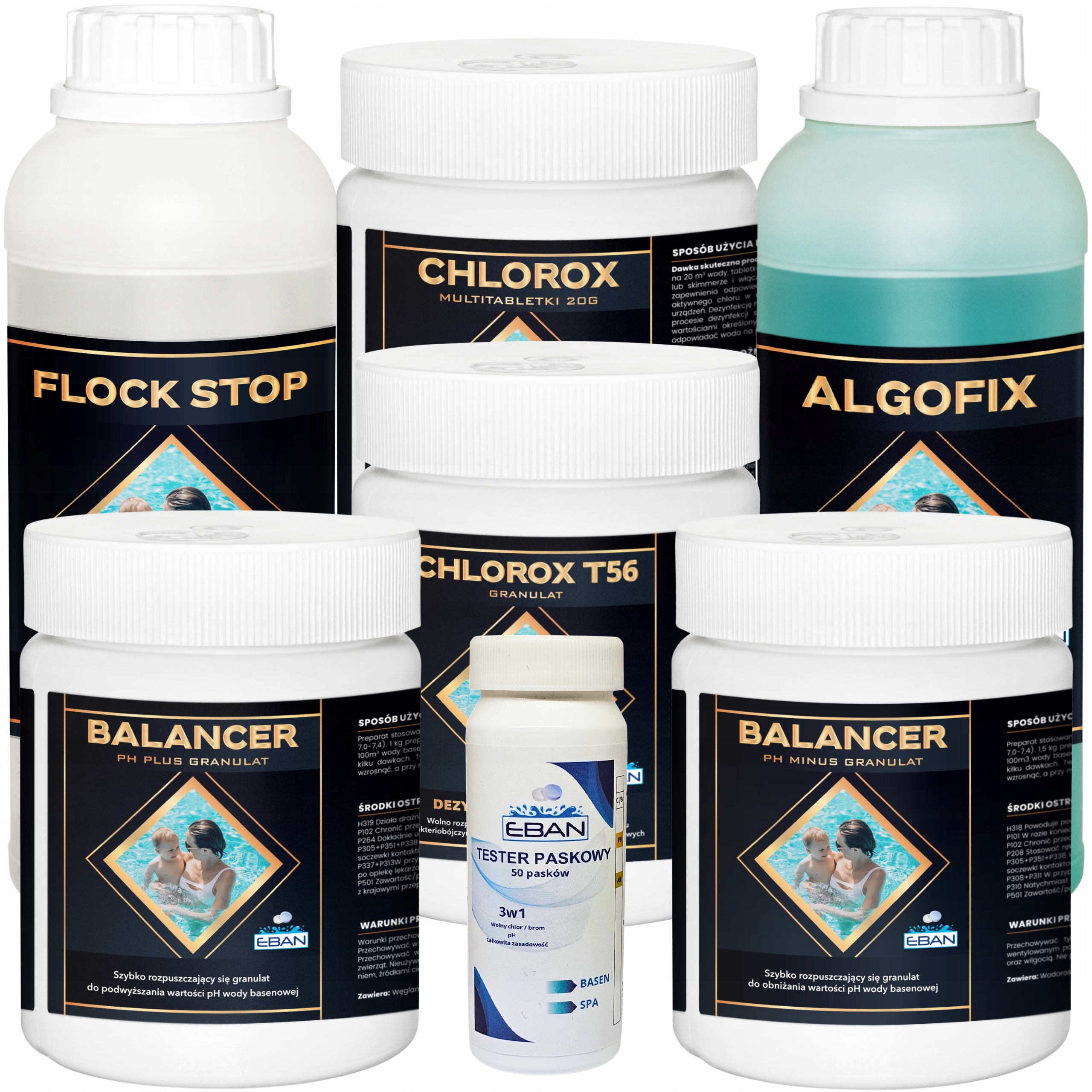 Набір, що містить основні засоби догляду за водою, такі як: рН балансир, таблетки хлору, анти -клон проти водоростей, не моніторний агент для поліпшення якості фільтра та тестеру POBS.