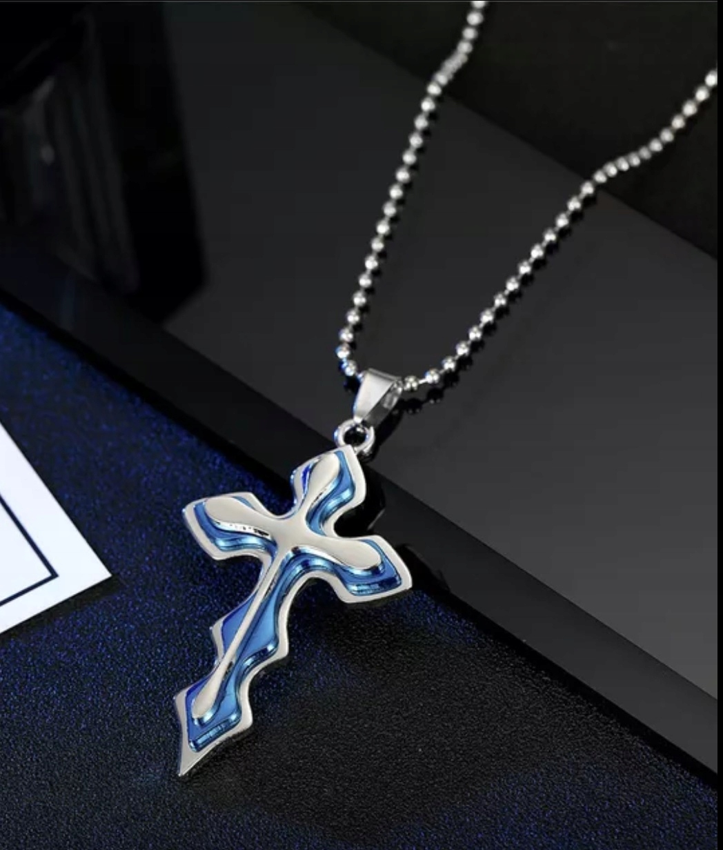 намисто довжиною 50 см із тришаровим корейським хрестиком у срібному та синьому кольорах! p>