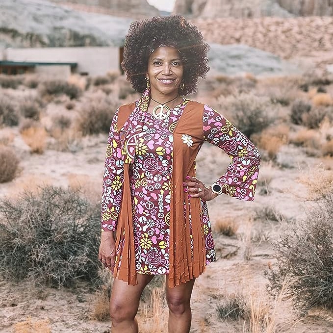 - 【М’яка та гнучка тканина】 - Цей костюм хіпі для жінок виготовлений зі 100% поліестеру, який має високу еластичність і міцність, забезпечуючи приємні відчуття під час носіння. Він ідеально сидить на вас, не тісний, не свербить і не жарить. Дуже гарний костюм із 60-х 70-х, ідеально підходить для вечірки хіпі або для повсякденного носіння.