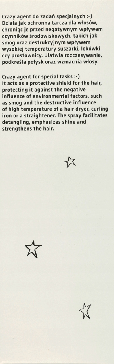 Crazy засіб для особливих завдань. Він діє як захисний щит для волосся, захищаючи його від негативного впливу факторів навколишнього середовища, таких як смог і руйнівний вплив високої температури< /b > фени, плойки або випрямлячі. Полегшує розчісування, підкреслює блиск і зміцнює волосся.