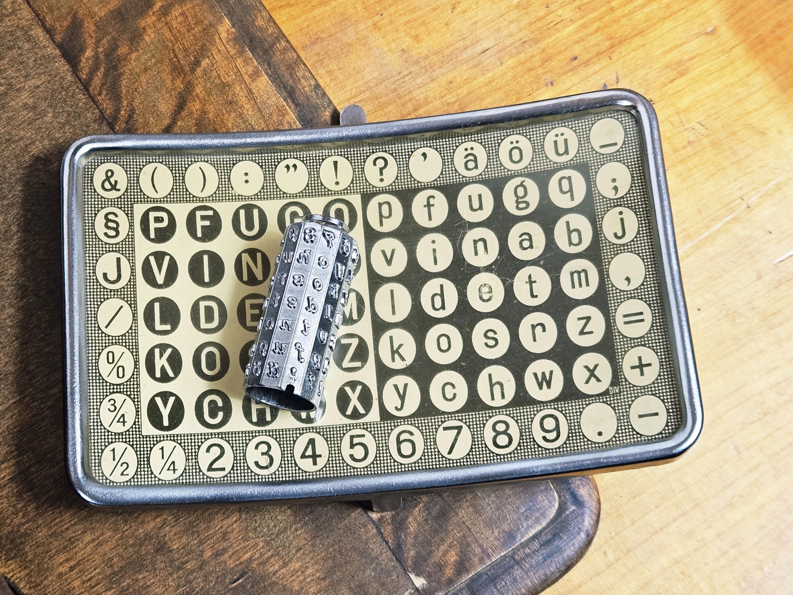 Візуальний стан: хороший, відсутня одна гайка на крайовій блискавці, ручка для закриття футляра, ролик шрифту є зламаний (в наявності є другий з гарним курсивом), свідомо не додавав ці елементи для збереження автентичності речі.