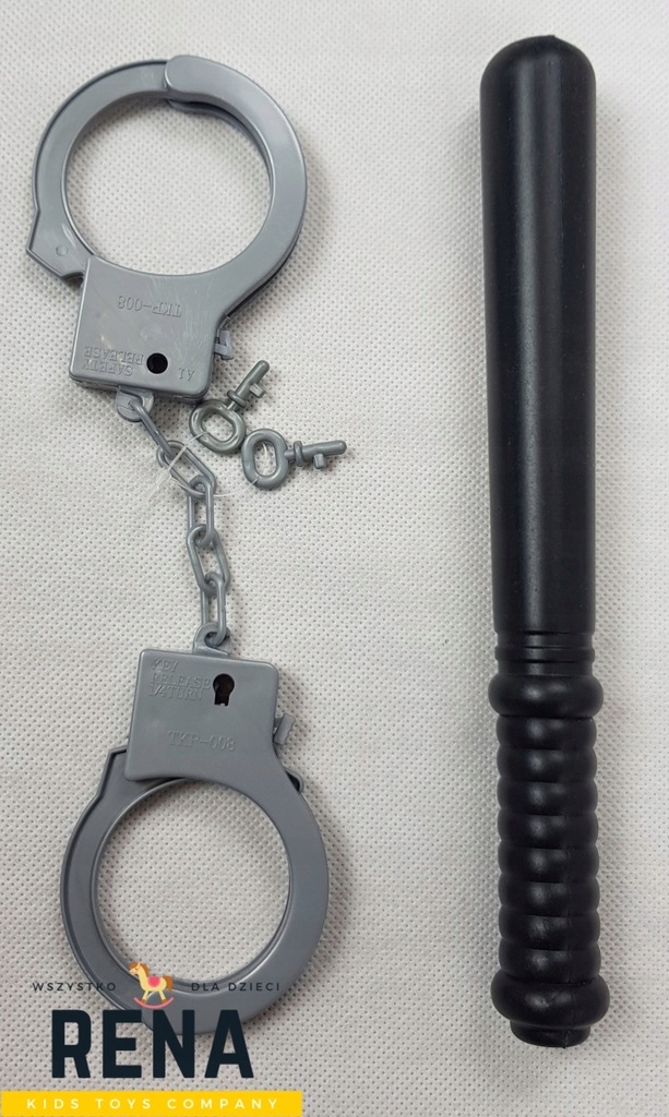 - КОМПЛЕКТ включає наручники з ключем і поліцейську палицю .