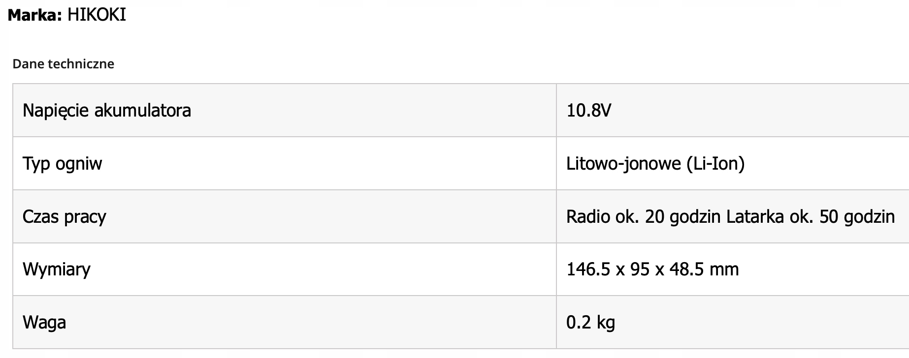 батарея4 Завдяки міцному корпусу з транспортною ручкою з профілюванням посередині для підвіски. Радіо призначене для роботи в майстернях, гаражах, кемпінгу. Радіо працює над джерелом живлення за допомогою акумуляторів Hikoki Cassette з напругами: 10,8 В (пік 12 В) відповідно. Дивно -графік з діаметром 40 мм дозволяє отримати хороший звук і високий обсяг радіопередачі слухав. Панель радіослужби інтуїтивно зрозуміла з чітко позначеною, я натискаю на службу. Ми можемо легко змінити джерело звуку - станції AM/FM, переключити радіостанцію або встановити відповідний гучність. Крім того, електронор оснащений побудованим світлодіодним ліхтариком, який буде корисним у аварійних ситуаціях для запалювання, наприклад. У випадку зникнення електроенергії.