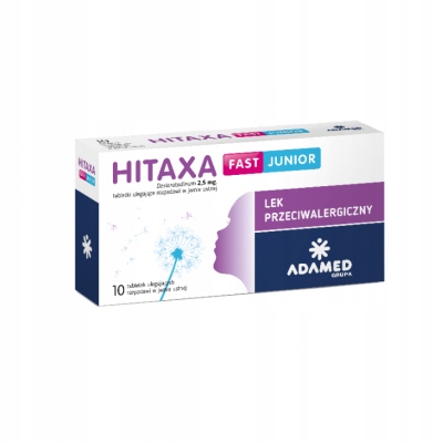 Хітакса Фаст Юніор, 2,5 мг, - це таблетки, які розпадаються в ротовій порожнині. Їх діюча речовина – дослоратадин. Дезлоратидин — антигістамінний препарат другого покоління, який перешкоджає зв’язуванню гістаміну з H1-рецепторами, таким чином пригнічуючи запальні процеси та їх симптоми, такі як свербіж, чхання або нежить. Дезлоратидин незначною мірою проникає в центральну нервову систему, тому не має седативного ефекту і не викликає сонливості. Тому це антигістамінний препарат другого покоління. За допомогою дезлоратадину Hitaxa Fast Junior полегшує симптоми, пов’язані з алергічним ринітом (запалення носових ходів, спричинене алергією, наприклад сінну лихоманку або алергію на пилових кліщів), такі як: чхання, свербіж або нежить, свербіж при збудженні, почервоніння. або сльозяться очі. Препарат також знімає симптоми кропив’янки. Симптоми цього стану включають свербіж шкіри та кропив’янку. Hitaxa Fast Junior полегшує контроль над алергічною реакцією та її симптомами.