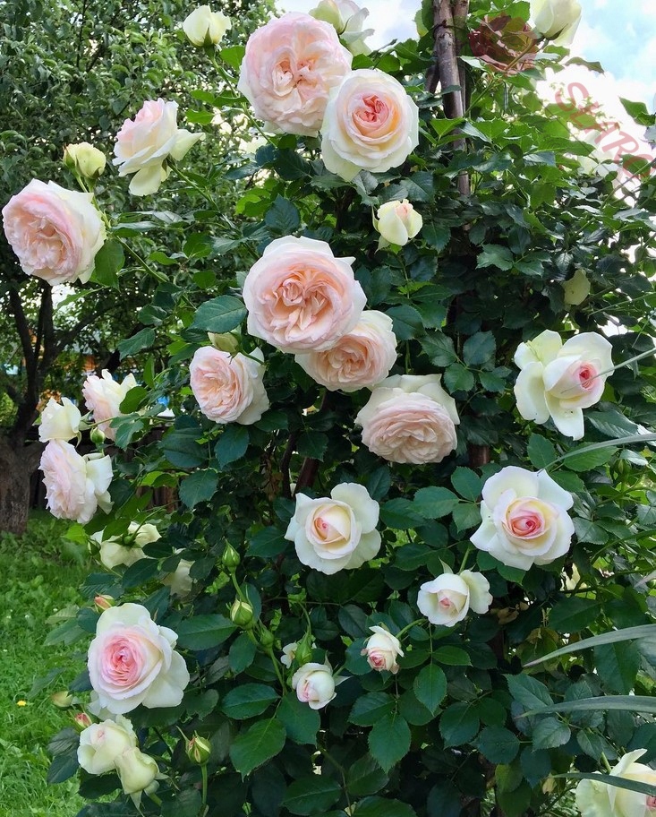 - Переваги: має великі повні квіти. Розвинені квіти нагадують англійські троянди. Він довго цвіте і повторює цвітіння.