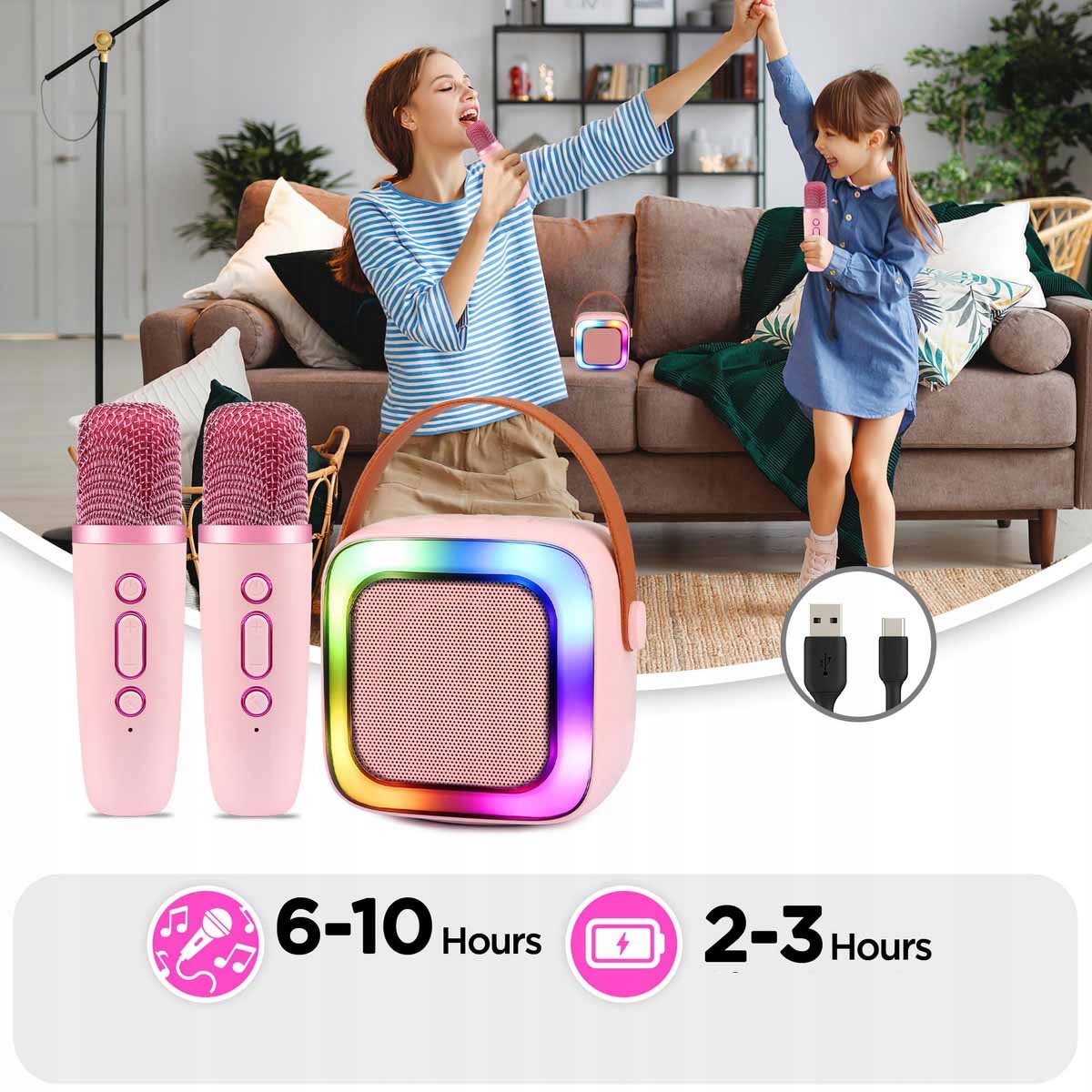 - Портативні динаміки для караоке та бездротові мікрофони компактні й легкі, тому їх легко носити навколо. Вбудована акумуляторна батарея забезпечує 6-10 годин відтворення, що ідеально підходить для святкових вечірок, днів народжень, подій на природі, сімейних зустрічей або подорожей